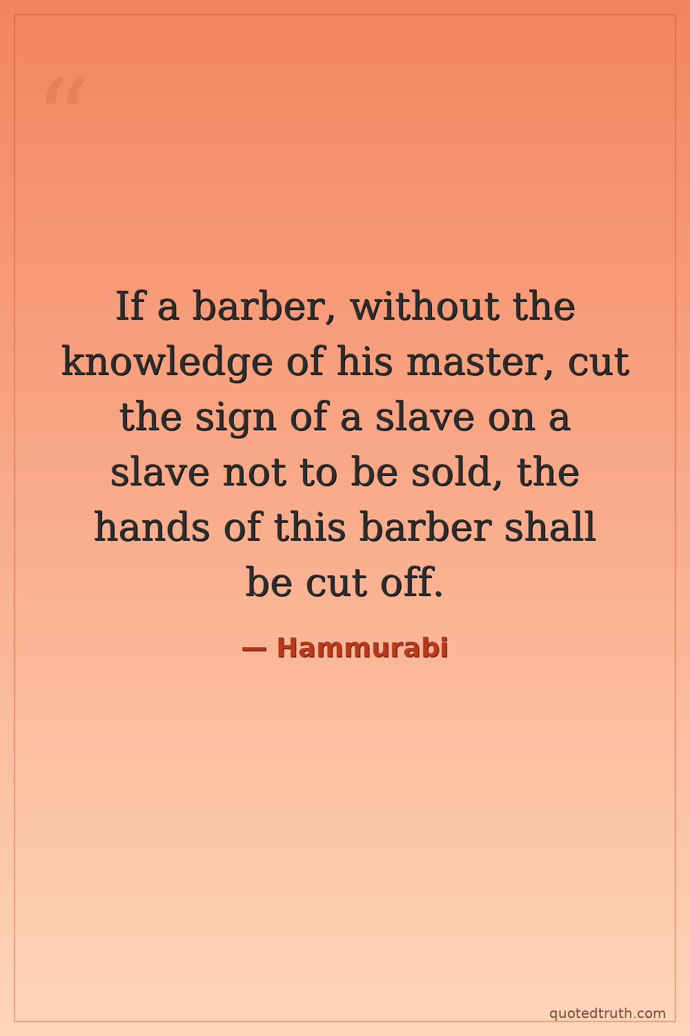 Humorous"If a barber, without the knowledge of the owner of a slave, cuts off the slave's 'mark,' he shall cut off the barber's fingers."