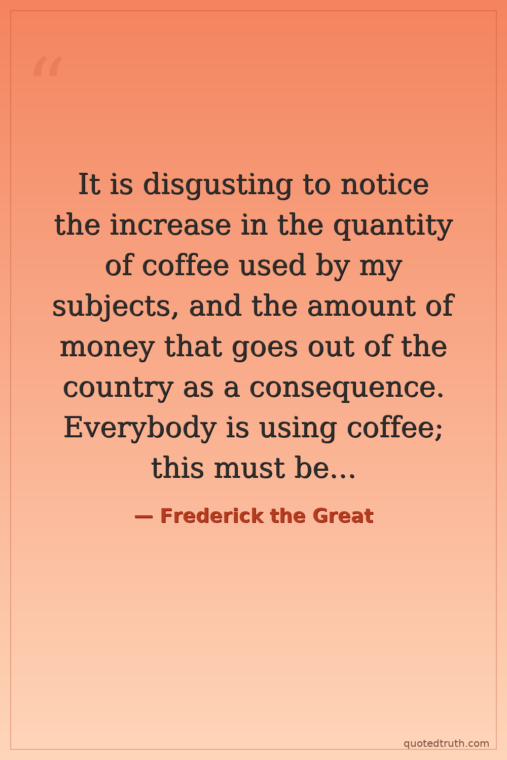 It is disgusting to notice the increase in the quantity of coffee used by my subjects, and the amount of money that goes out of the country as a consequence. Everybody is using coffee; this must be prevented. His Majesty was brought up on beer, and so were both his ancestors and officers. Many battles have been fought and won by soldiers nourished on beer, and the King does not believe that coffee-drinking soldiers can be relied upon to endure hardships in case of another war.