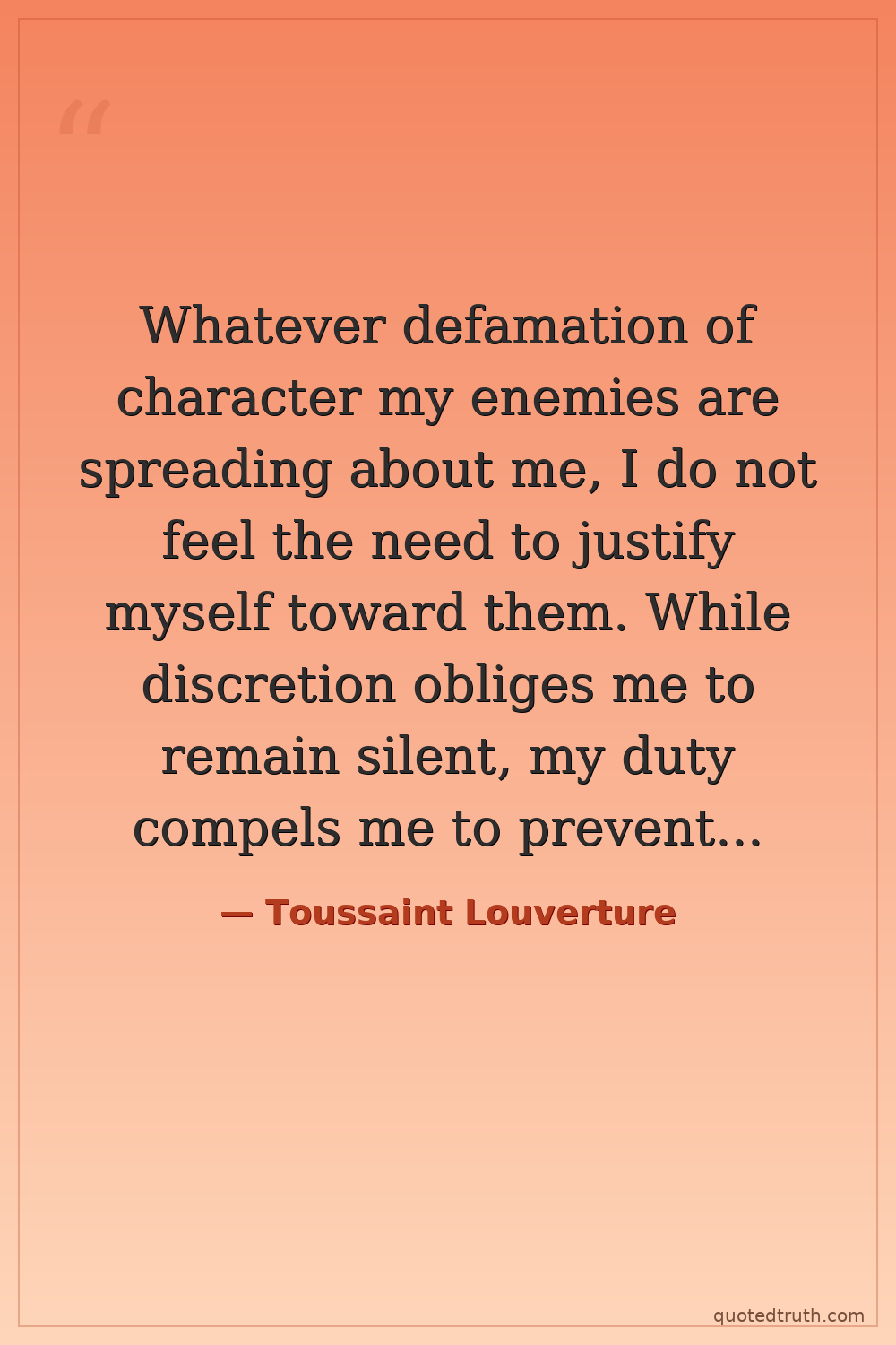 Whatever defamation of character my enemies are spreading about me, I do not feel the need to justify myself toward them. While discretion obliges me to remain silent, my duty compels me to prevent them from doing any more harm.
