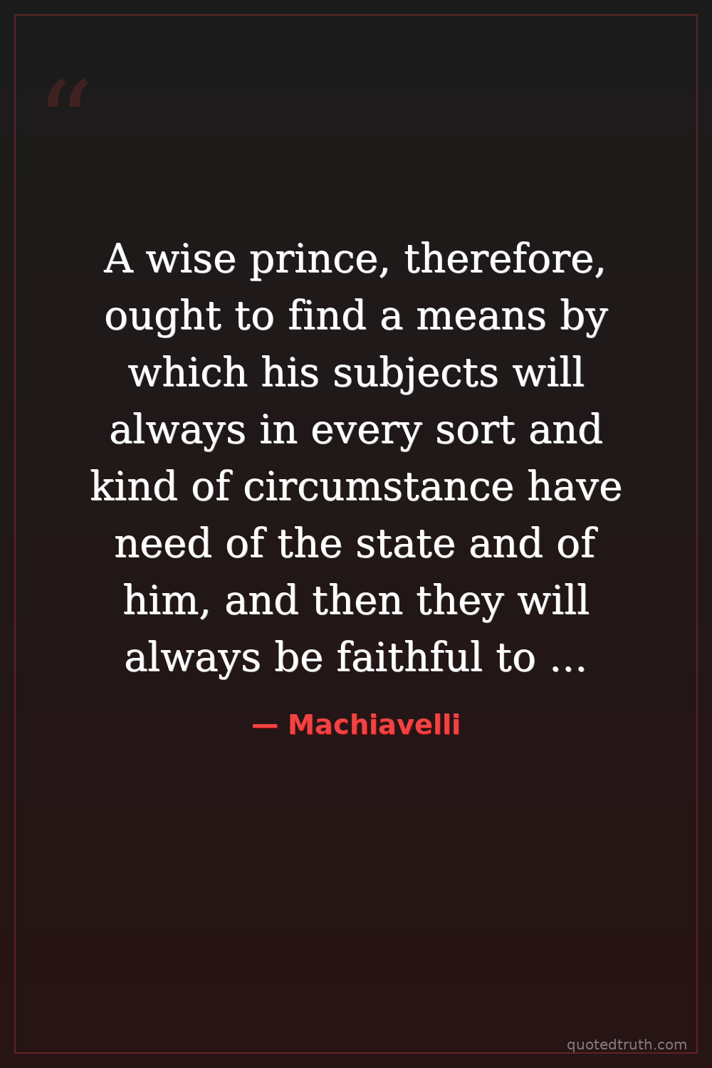 A wise prince, therefore, ought to find a means by which his subjects will always in every sort and kind of circumstance have need of the state and of him, and then they will always be faithful to him.