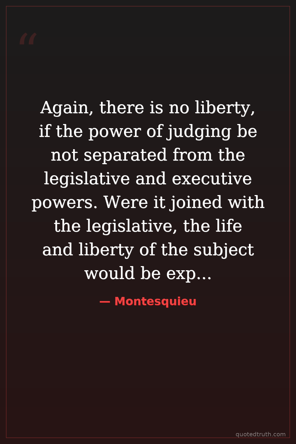 Again, there is no liberty, if the power of judging be not separated from the legislative and executive powers. Were it joined with the legislative, the life and liberty of the subject would be exposed to arbitrary control; for the judge would be then the legislator. Were it joined to the executive power, the judge might behave with all the violence of an oppressor.