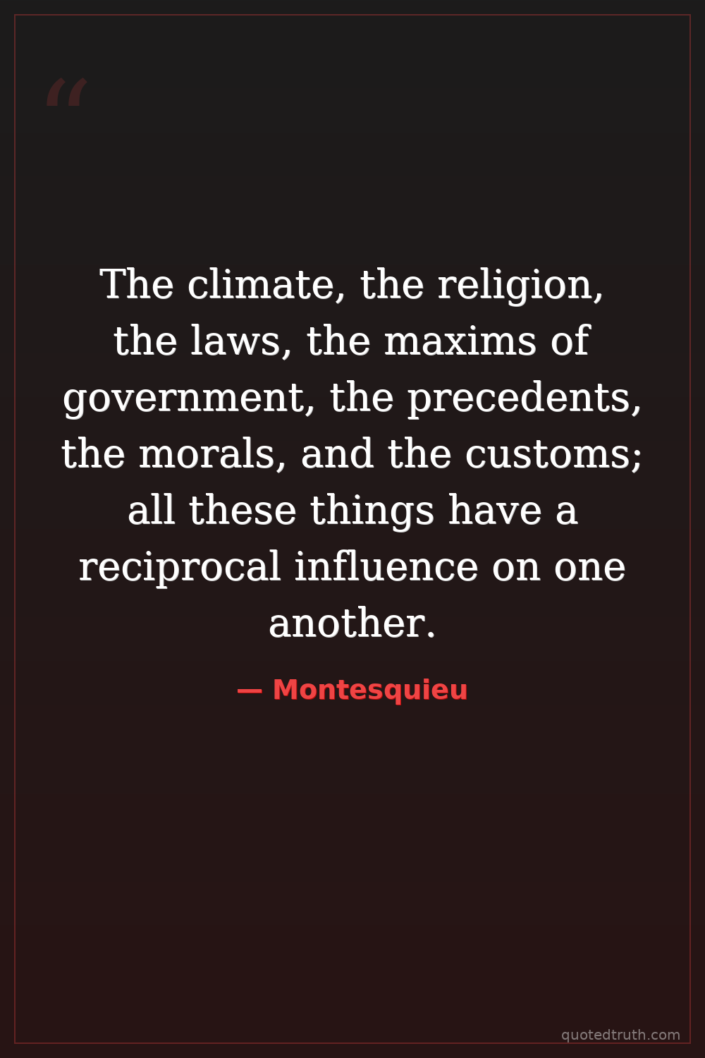 The climate, the religion, the laws, the maxims of government, the precedents, the morals, and the customs; all these things have a reciprocal influence on one another.