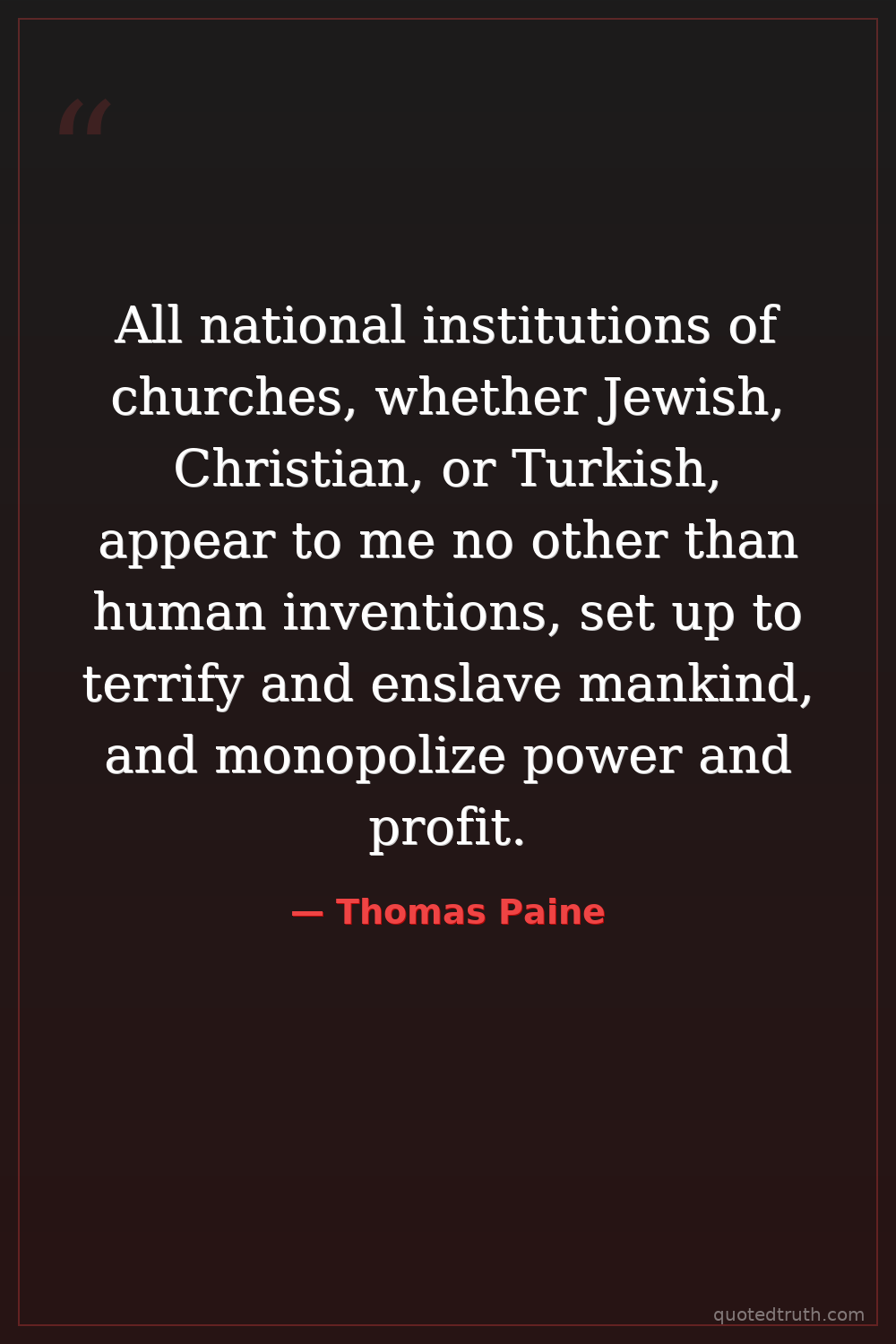 All national institutions of churches, whether Jewish, Christian, or Turkish, appear to me no other than human inventions, set up to terrify and enslave mankind, and monopolize power and profit.
