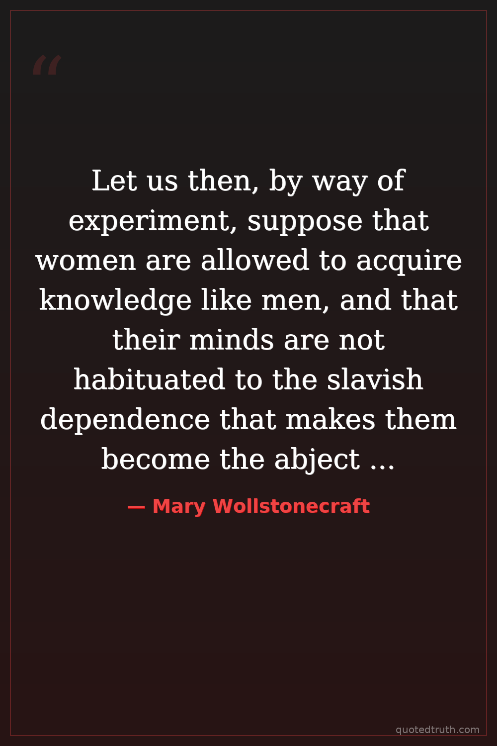 Let us then, by way of experiment, suppose that women are allowed to acquire knowledge like men, and that their minds are not habituated to the slavish dependence that makes them become the abject tools of their masters.
