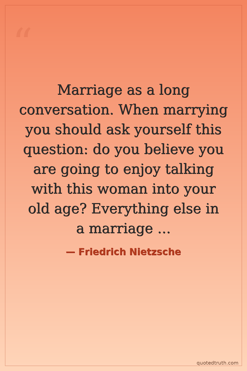 Marriage as a long conversation. When marrying you should ask yourself this question: do you believe you are going to enjoy talking with this woman into your old age? Everything else in a marriage is transitory, but most of the time that you're together will be devoted to conversation.