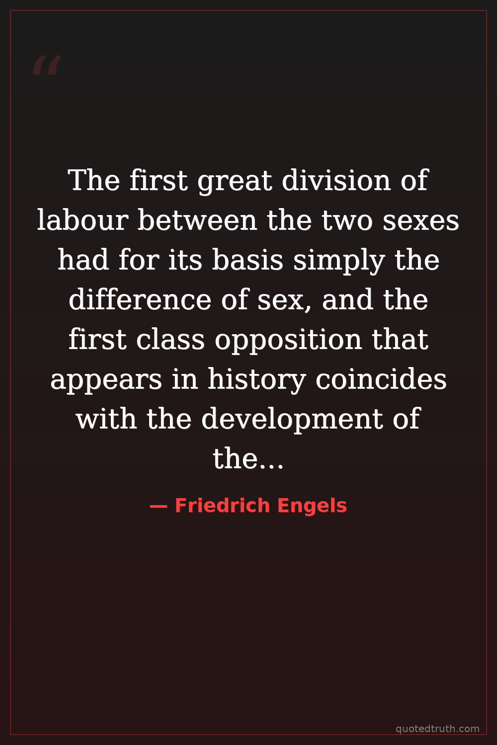 The first great division of labour between the two sexes had for its basis simply the difference of sex, and the first class opposition that appears in history coincides with the development of the antagonism between man and woman in monogamous marriage, and the first class oppression coincides with that of the female sex by the male.