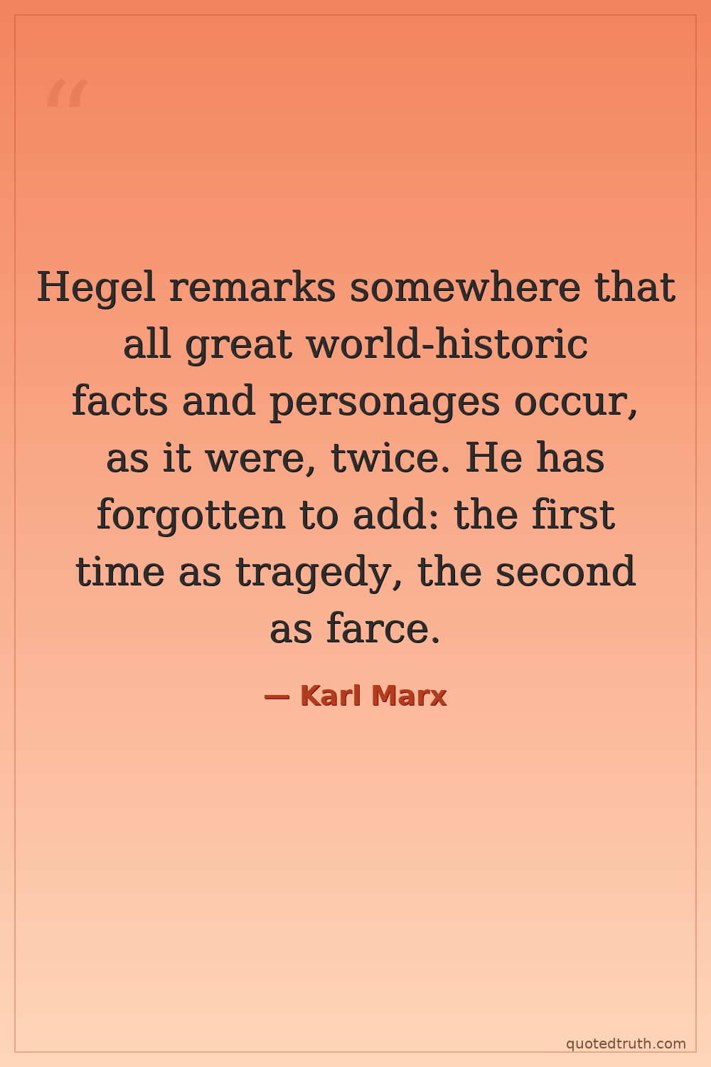 Hegel remarks somewhere that all great world-historic facts and personages occur, as it were, twice. He has forgotten to add: the first time as tragedy, the second as farce.