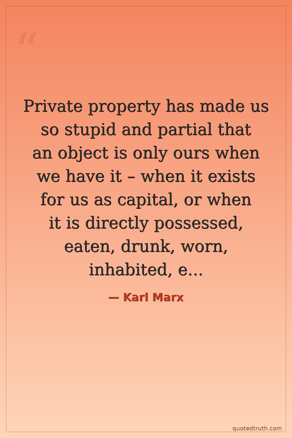 Private property has made us so stupid and partial that an object is only ours when we have it – when it exists for us as capital, or when it is directly possessed, eaten, drunk, worn, inhabited, etc., – in short, when it is used by us. In the place of all physical and mental senses there has therefore come the sheer estrangement of all these senses, the sense of having.