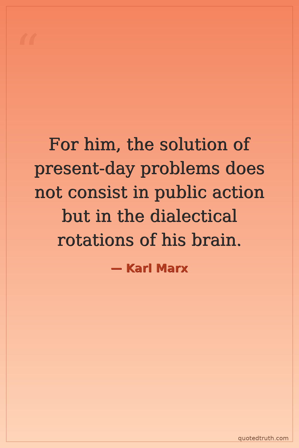For him, the solution of present-day problems does not consist in public action but in the dialectical rotations of his brain.