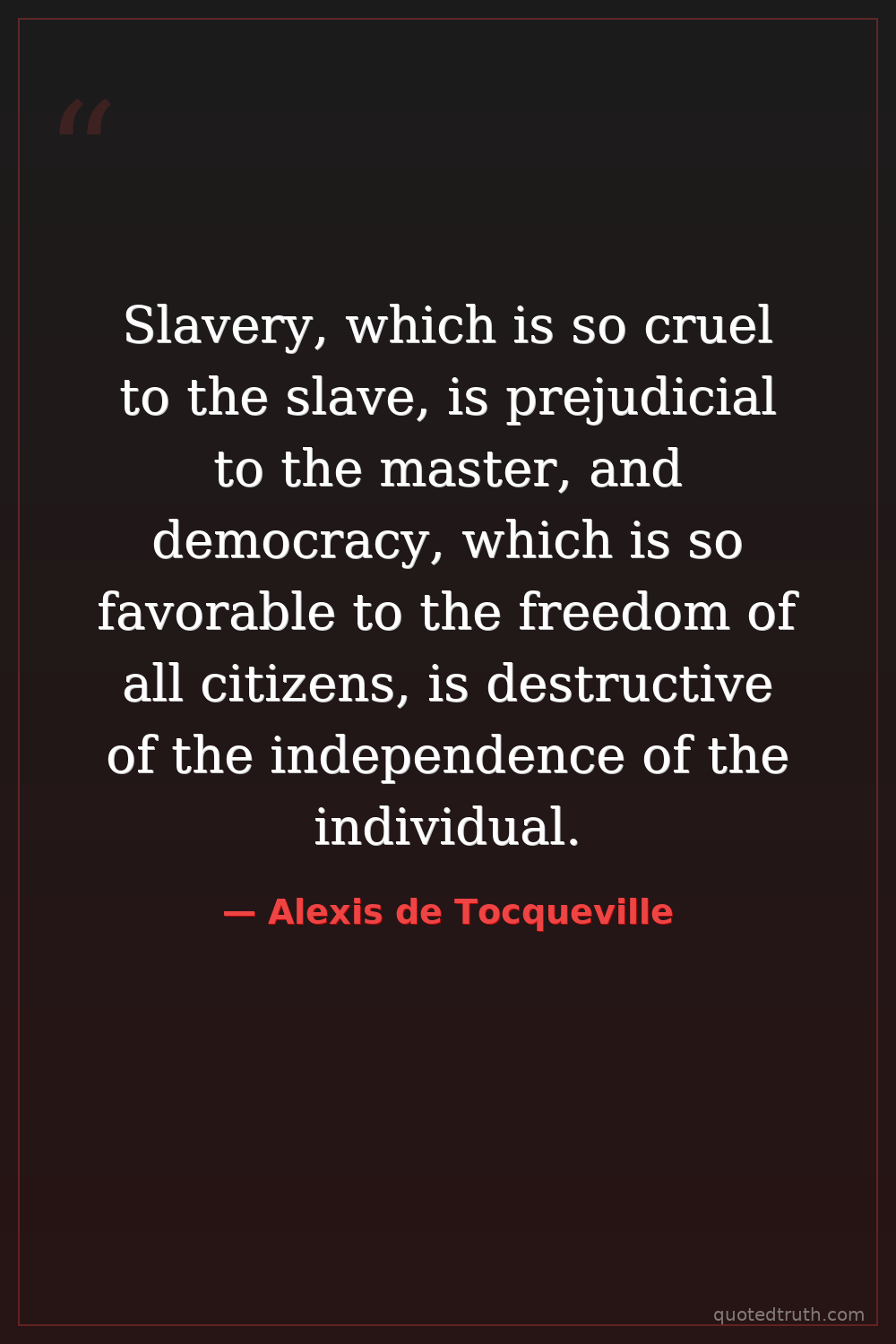 Slavery, which is so cruel to the slave, is prejudicial to the master, and democracy, which is so favorable to the freedom of all citizens, is destructive of the independence of the individual.