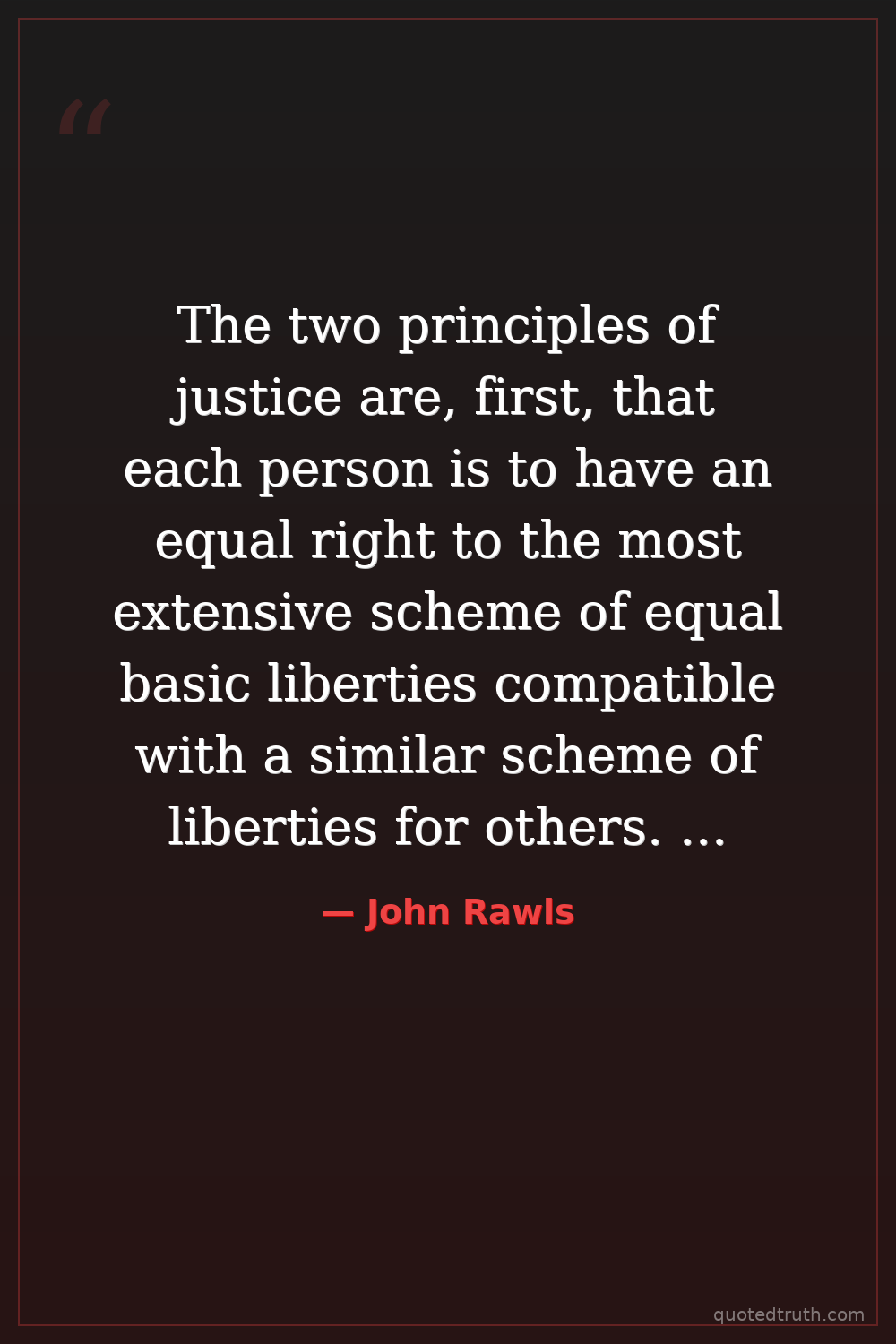 The two principles of justice are, first, that each person is to have an equal right to the most extensive scheme of equal basic liberties compatible with a similar scheme of liberties for others. Second, social and economic inequalities are to be arranged so that they are both (a) reasonably expected to be to everyone's advantage, and (b) attached to positions and offices open to all.