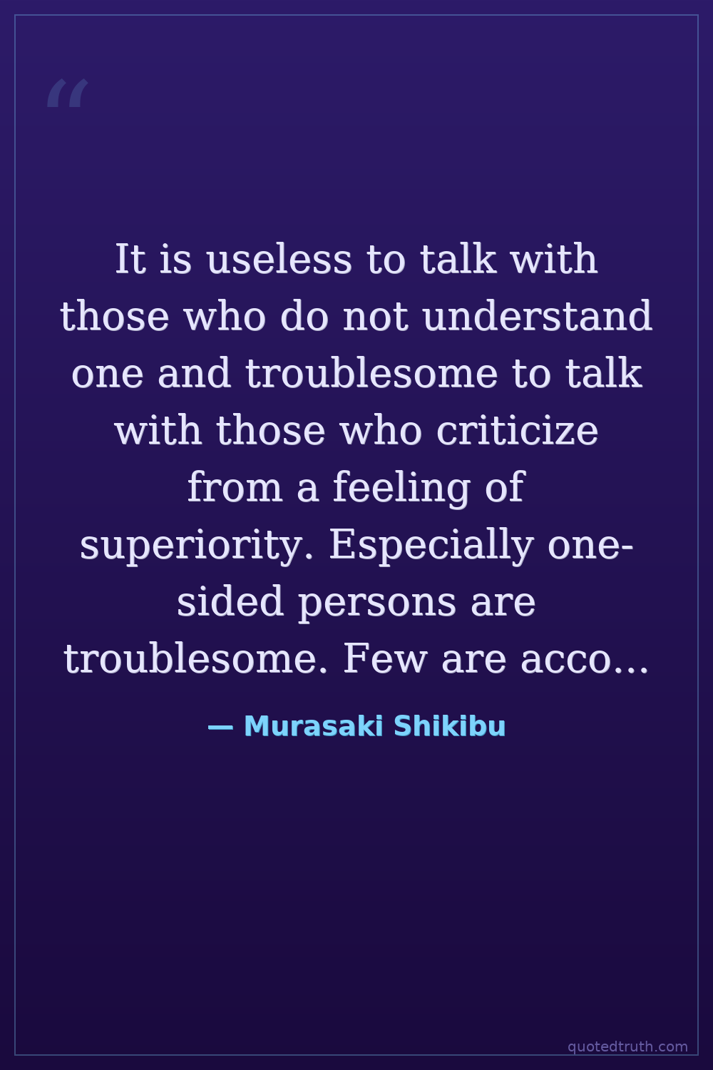 It is useless to talk with those who do not understand one and troublesome to talk with those who criticize from a feeling of superiority. Especially one-sided persons are troublesome. Few are accomplished in many arts and most cling narrowly to their own opinion.