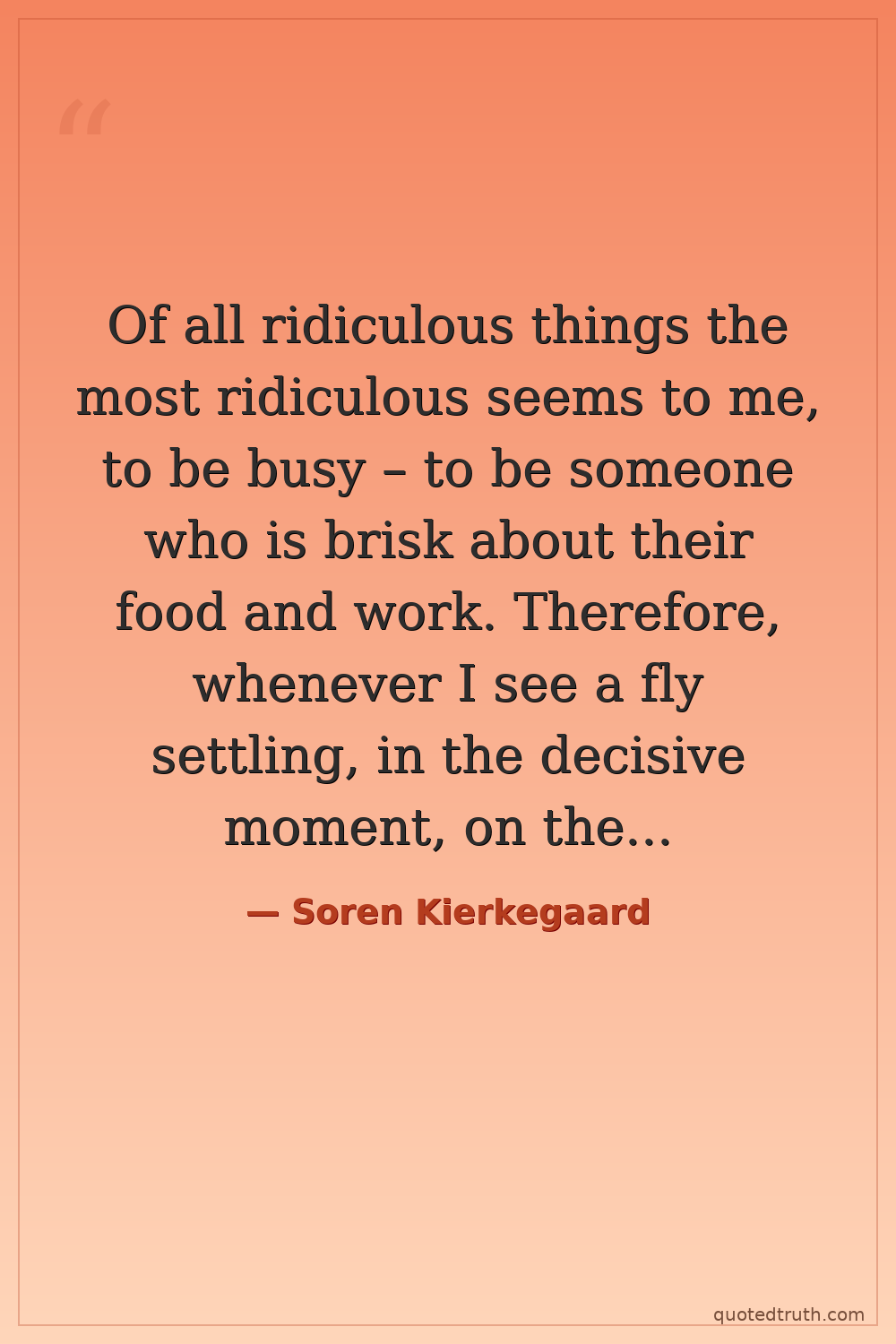 Of all ridiculous things the most ridiculous seems to me, to be busy – to be someone who is brisk about their food and work. Therefore, whenever I see a fly settling, in the decisive moment, on the nose of such a person of affairs; or if he is spattered with mud from a carriage which drives past him in still greater haste; or the drawbridge opens up before him; or a tile falls down and knocks him dead, then I laugh heartily.