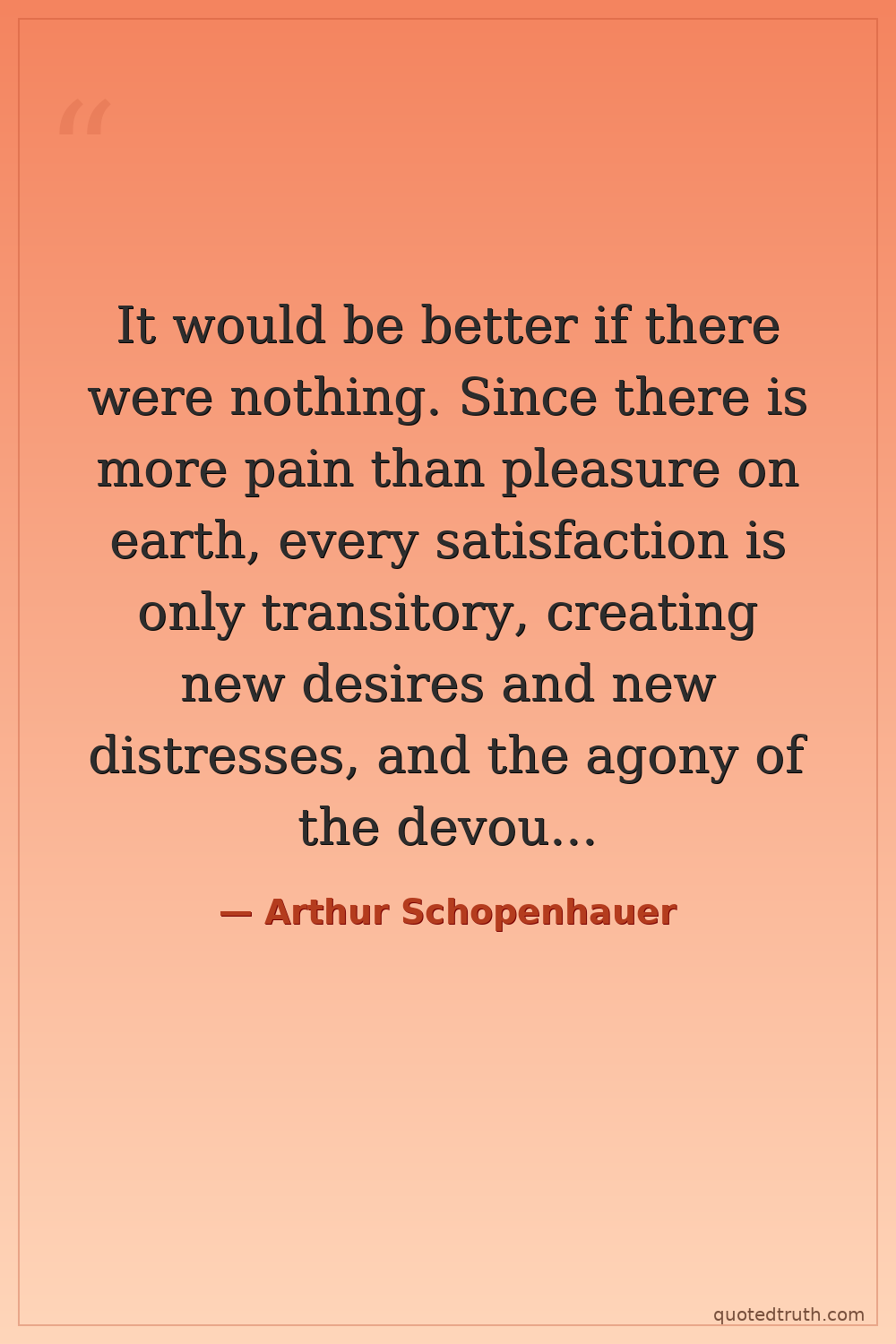 It would be better if there were nothing. Since there is more pain than pleasure on earth, every satisfaction is only transitory, creating new desires and new distresses, and the agony of the devoured animal is always far greater than the pleasure of the devourer.