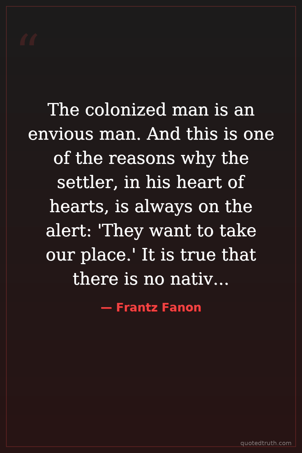 The colonized man is an envious man. And this is one of the reasons why the settler, in his heart of hearts, is always on the alert: 'They want to take our place.' It is true that there is no native who does not dream at least once a day of setting himself up in the settler's place.