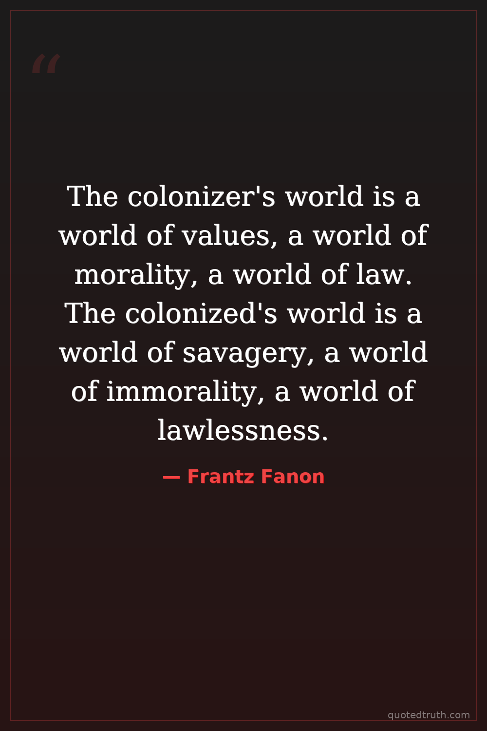 The colonizer's world is a world of values, a world of morality, a world of law. The colonized's world is a world of savagery, a world of immorality, a world of lawlessness.