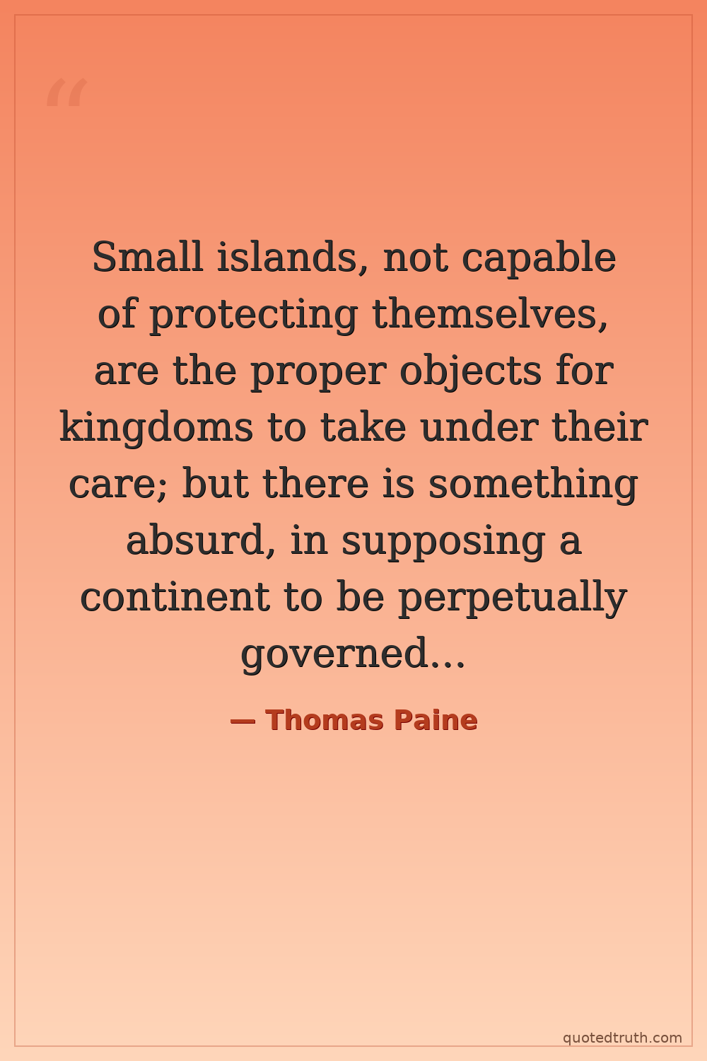 Small islands, not capable of protecting themselves, are the proper objects for kingdoms to take under their care; but there is something absurd, in supposing a continent to be perpetually governed by an island.