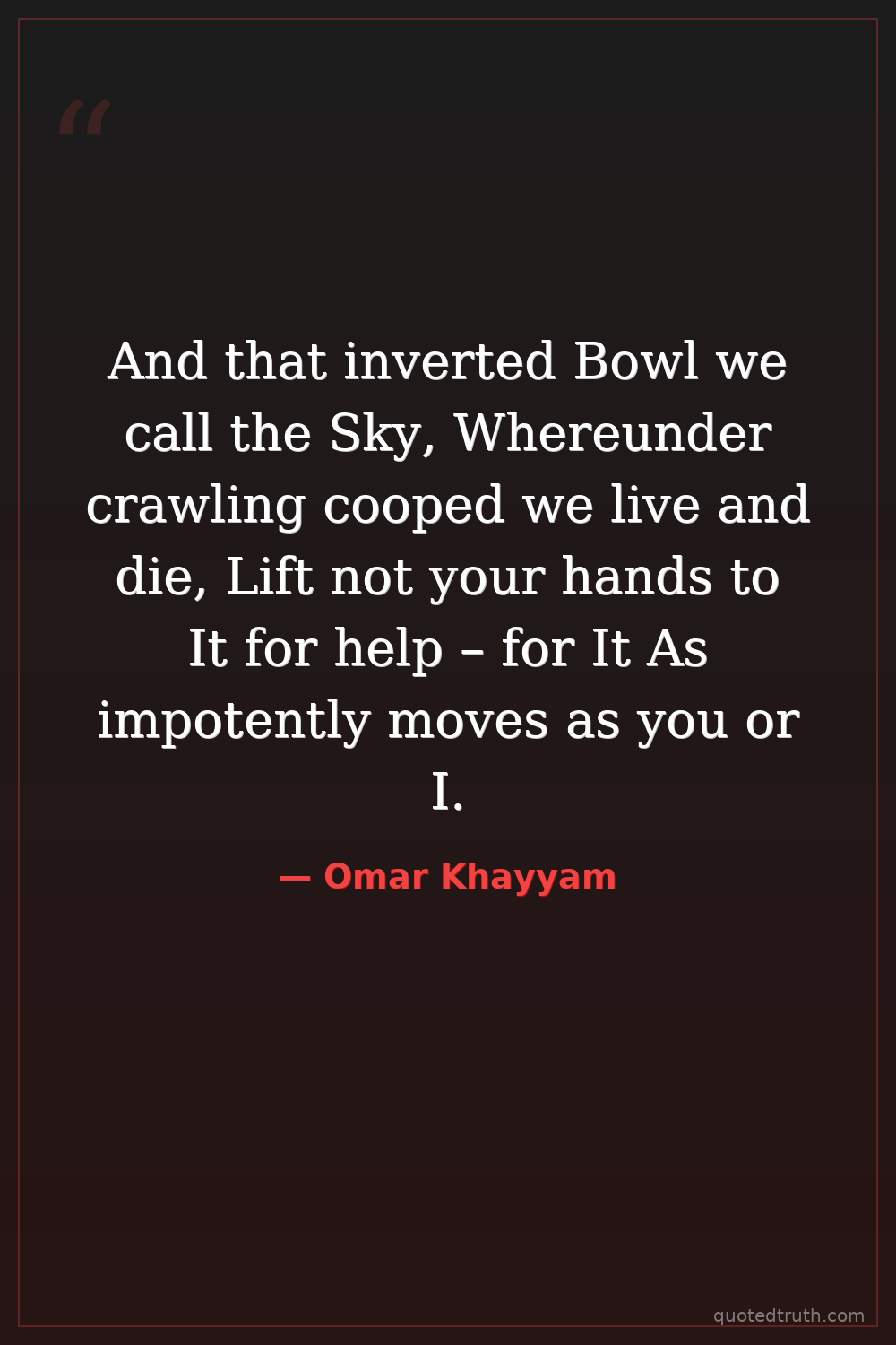 And that inverted Bowl we call the Sky, Whereunder crawling cooped we live and die, Lift not your hands to It for help – for It As impotently moves as you or I.