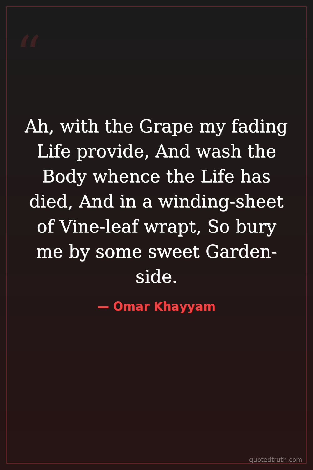 Ah, with the Grape my fading Life provide, And wash the Body whence the Life has died, And in a winding-sheet of Vine-leaf wrapt, So bury me by some sweet Garden-side.