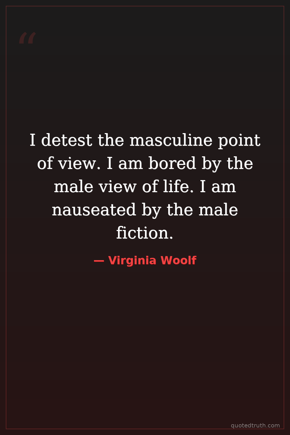 I detest the masculine point of view. I am bored by the male view of life. I am nauseated by the male fiction.