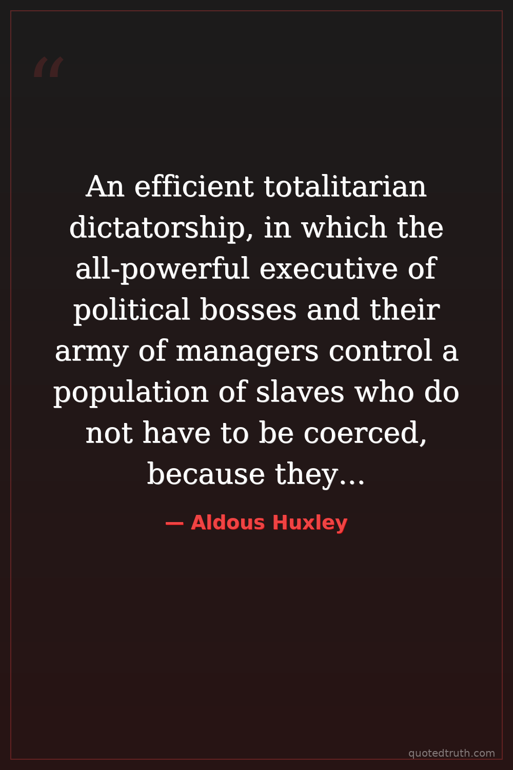 An efficient totalitarian dictatorship, in which the all-powerful executive of political bosses and their army of managers control a population of slaves who do not have to be coerced, because they love their servitude, is still a long way off. But it is not an impossibility, and to a great extent, it has already been realized.