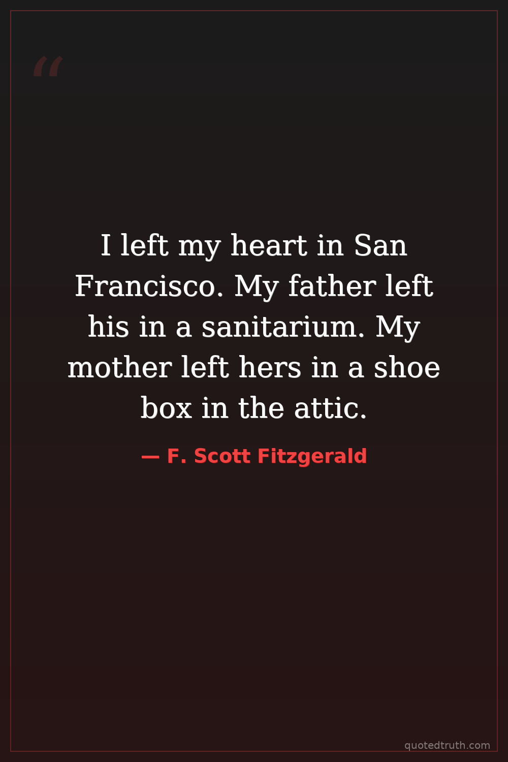 I left my heart in San Francisco. My father left his in a sanitarium. My mother left hers in a shoe box in the attic.
