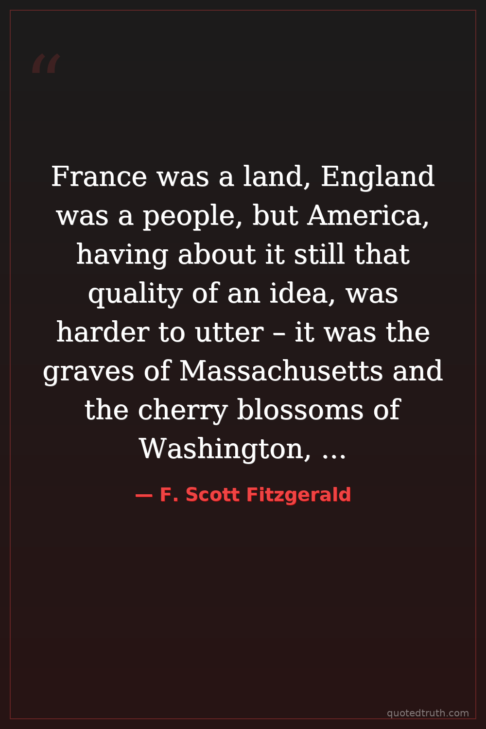 France was a land, England was a people, but America, having about it still that quality of an idea, was harder to utter – it was the graves of Massachusetts and the cherry blossoms of Washington, and yet it was still a young girl in a bathing suit, selling Coca-Cola on the boardwalk at Atlantic City.