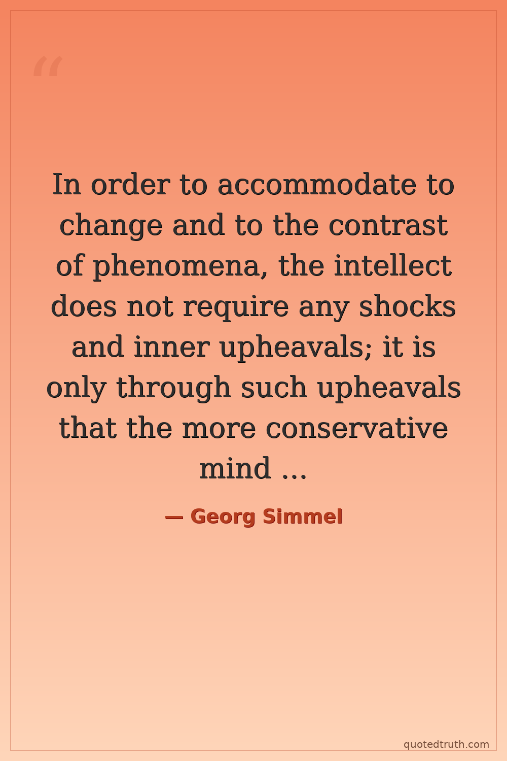 In order to accommodate to change and to the contrast of phenomena, the intellect does not require any shocks and inner upheavals; it is only through such upheavals that the more conservative mind could accommodate to the metropolitan rhythm of events.