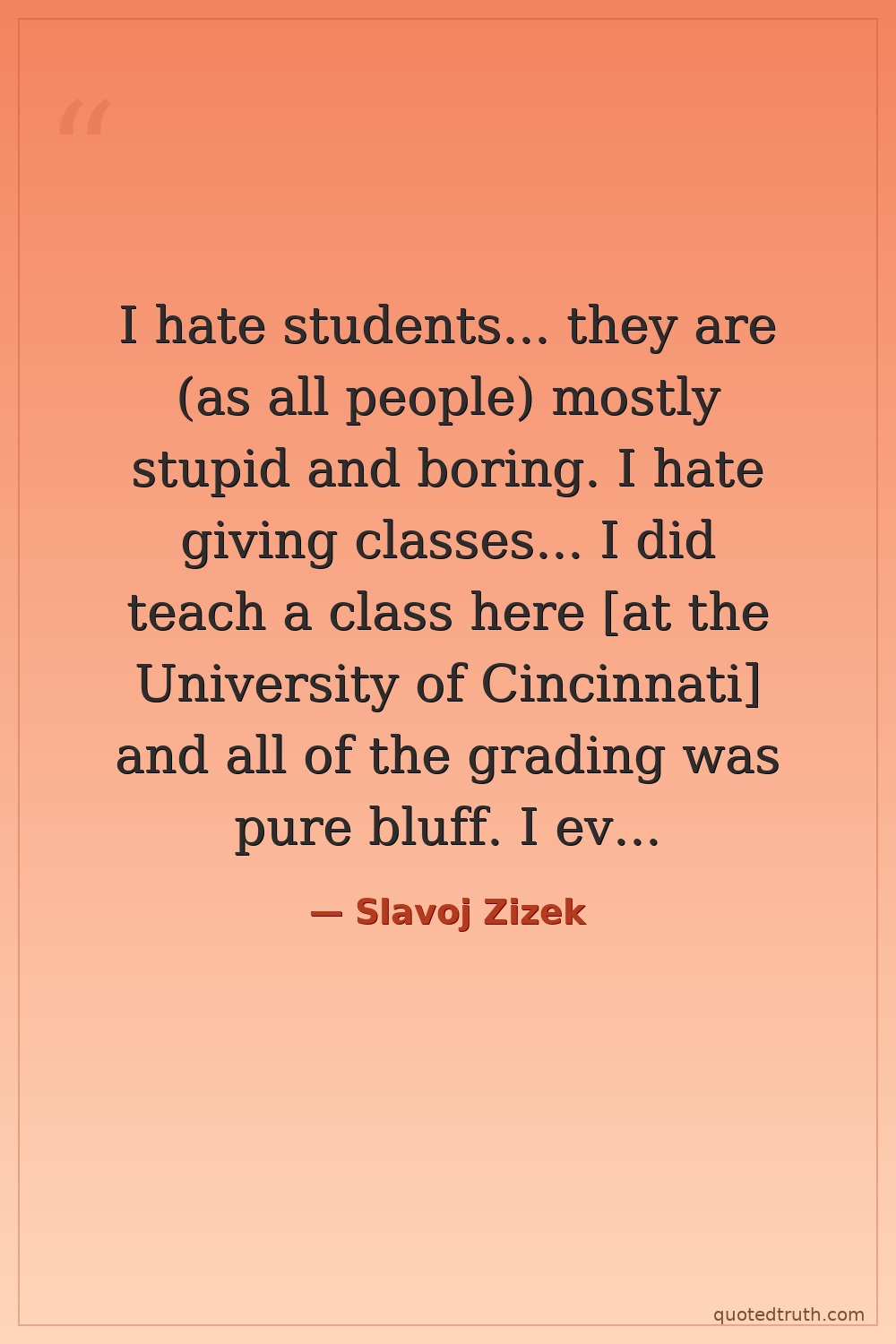 I hate students... they are (as all people) mostly stupid and boring. I hate giving classes... I did teach a class here [at the University of Cincinnati] and all of the grading was pure bluff. I even told students at the New School for example… if you don't give me any of your shitty papers, you get an A.