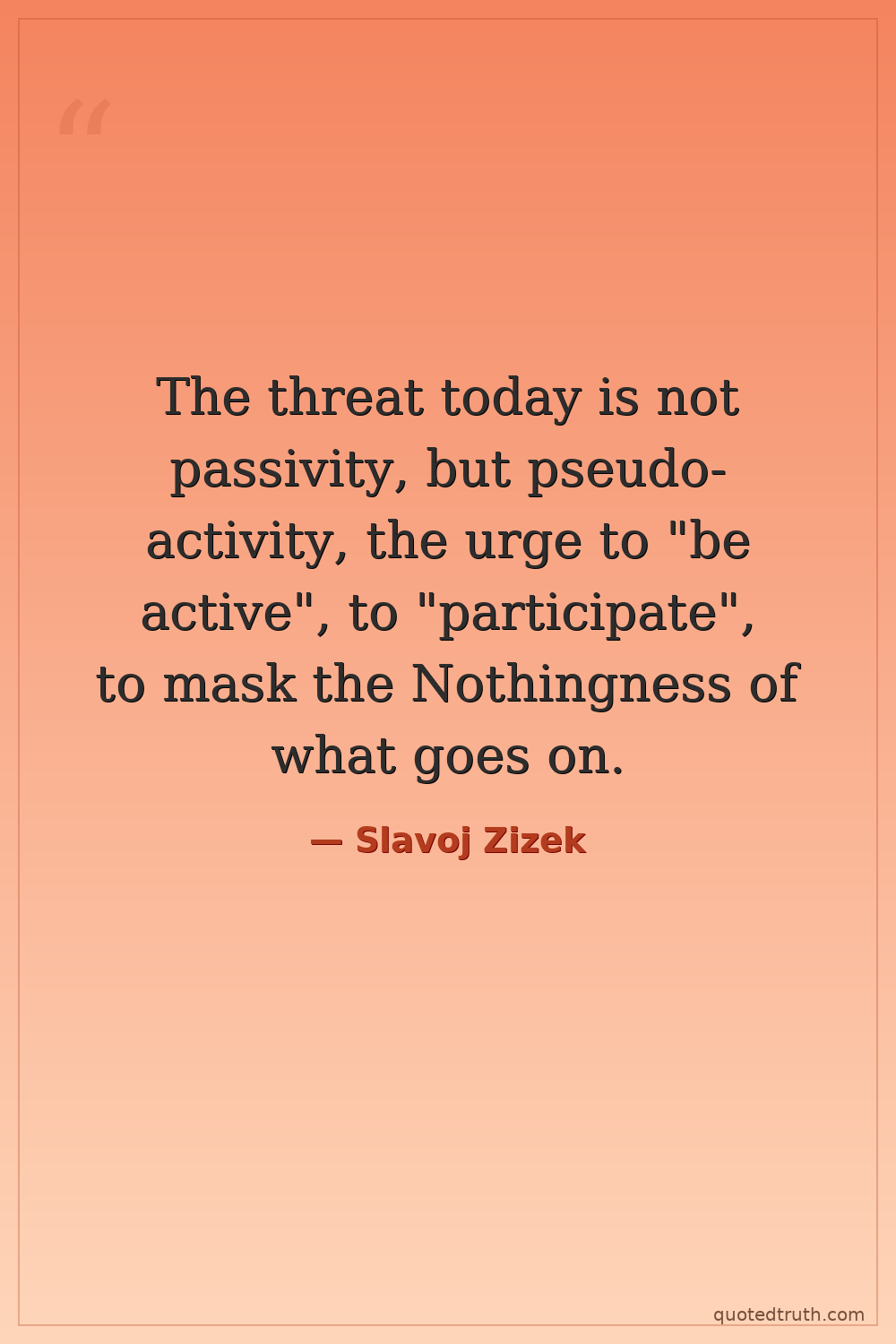 The threat today is not passivity, but pseudo-activity, the urge to "be active", to "participate", to mask the Nothingness of what goes on.