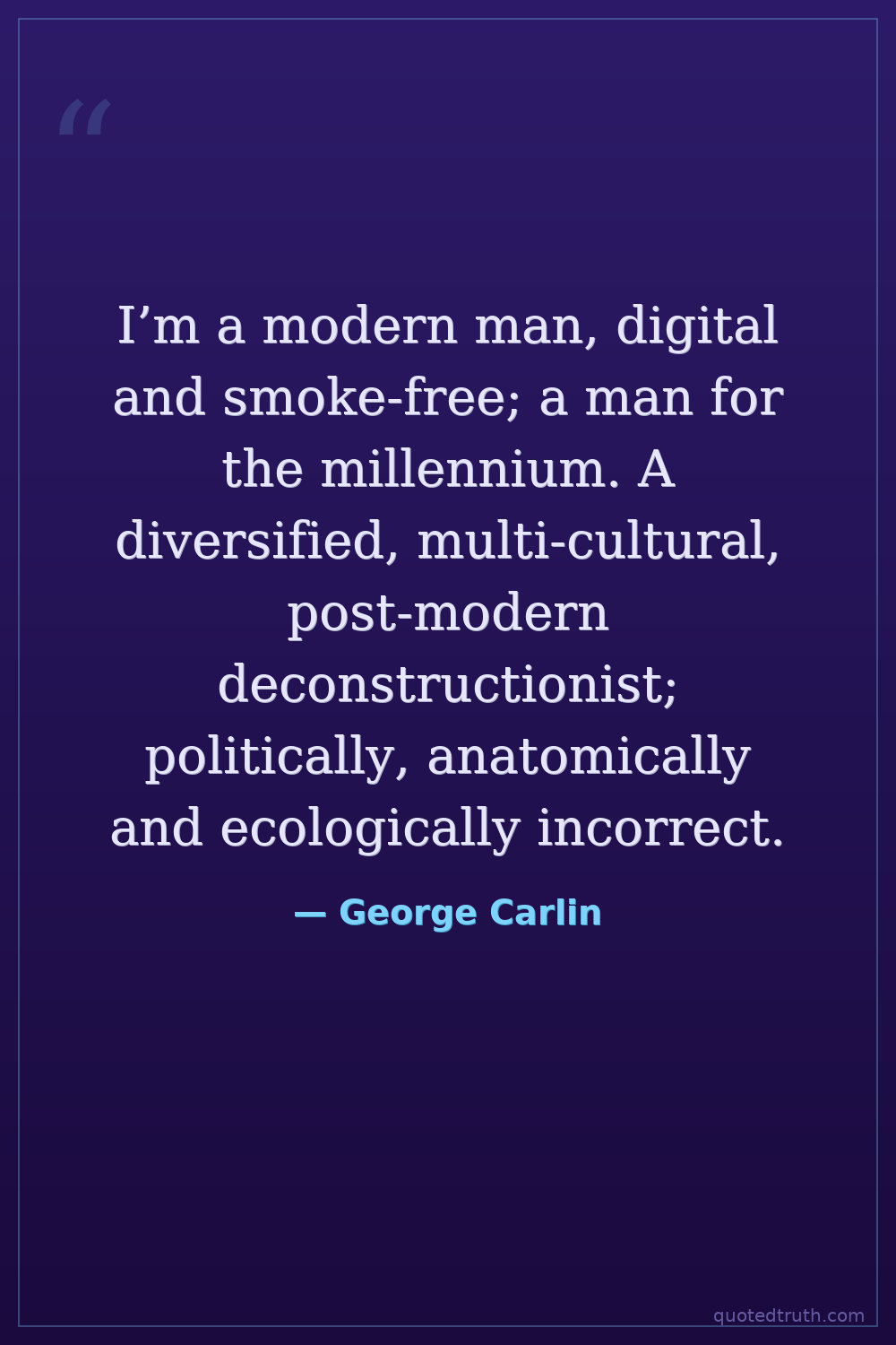 I’m a modern man, digital and smoke-free; a man for the millennium. A diversified, multi-cultural, post-modern deconstructionist; politically, anatomically and ecologically incorrect.