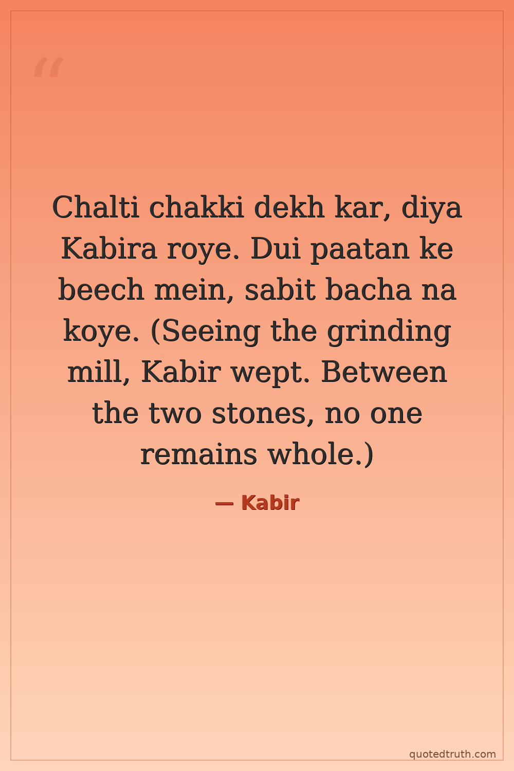 Chalti chakki dekh kar, diya Kabira roye. Dui paatan ke beech mein, sabit bacha na koye. (Seeing the grinding mill, Kabir wept. Between the two stones, no one remains whole.)