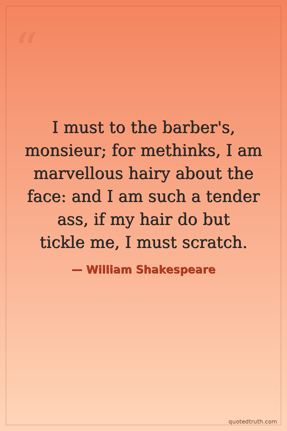 I must to the barber's, monsieur; for methinks, I am marvellous hairy about the face: and I am such a tender ass, if my hair do but tickle me, I must scratch.