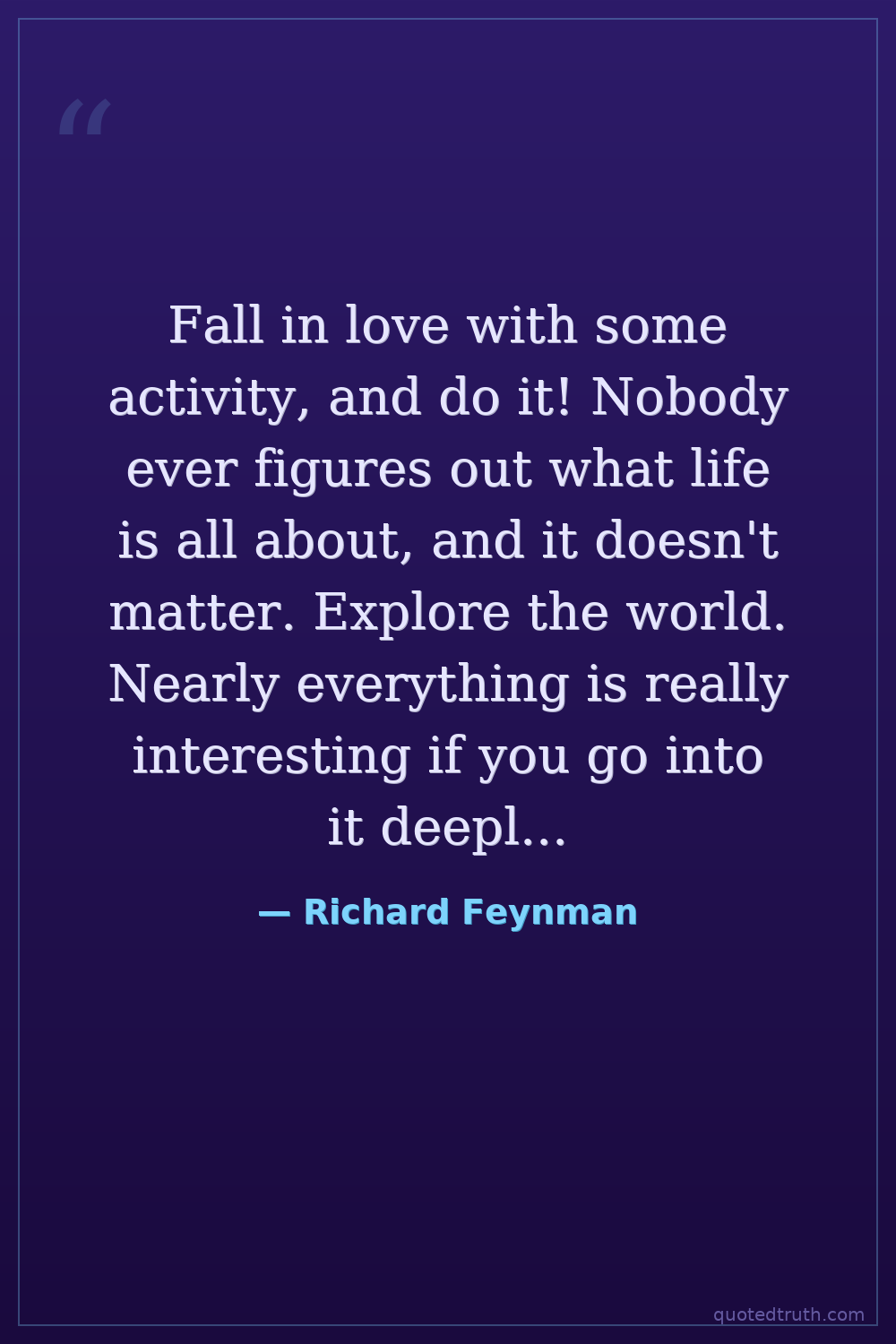 Fall in love with some activity, and do it! Nobody ever figures out what life is all about, and it doesn't matter. Explore the world. Nearly everything is really interesting if you go into it deeply enough.