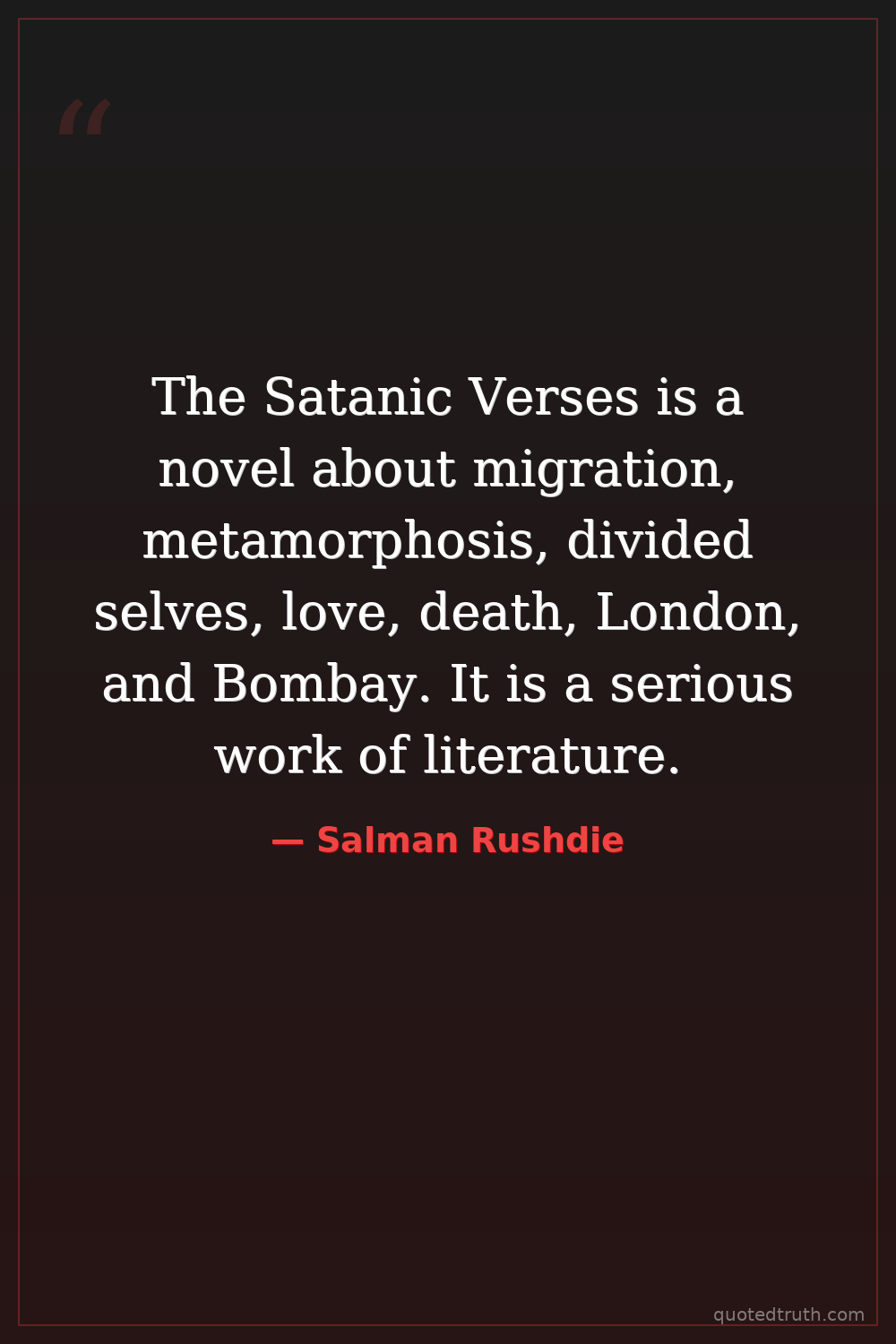 The Satanic Verses is a novel about migration, metamorphosis, divided selves, love, death, London, and Bombay. It is a serious work of literature.