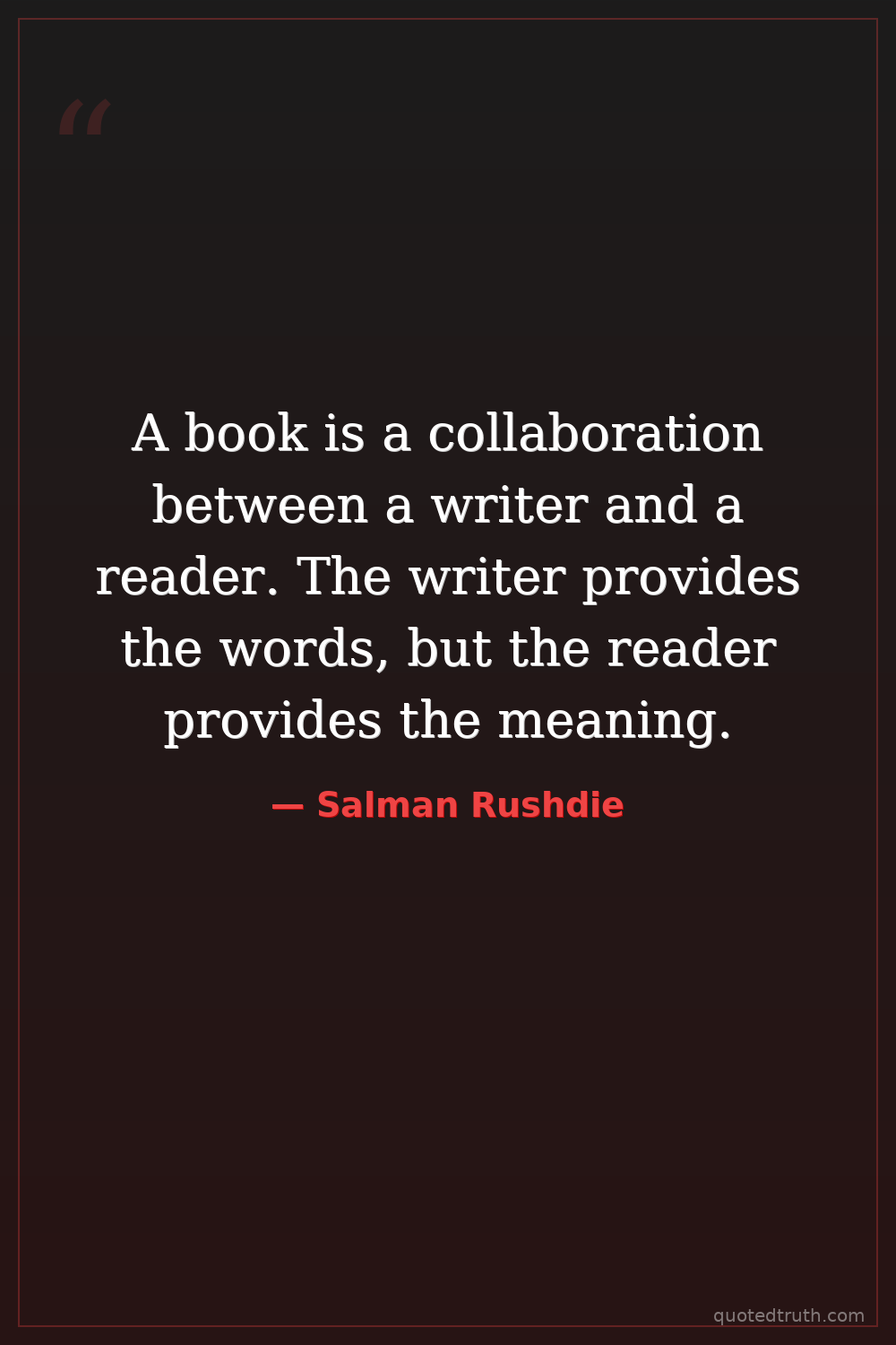 A book is a collaboration between a writer and a reader. The writer provides the words, but the reader provides the meaning.