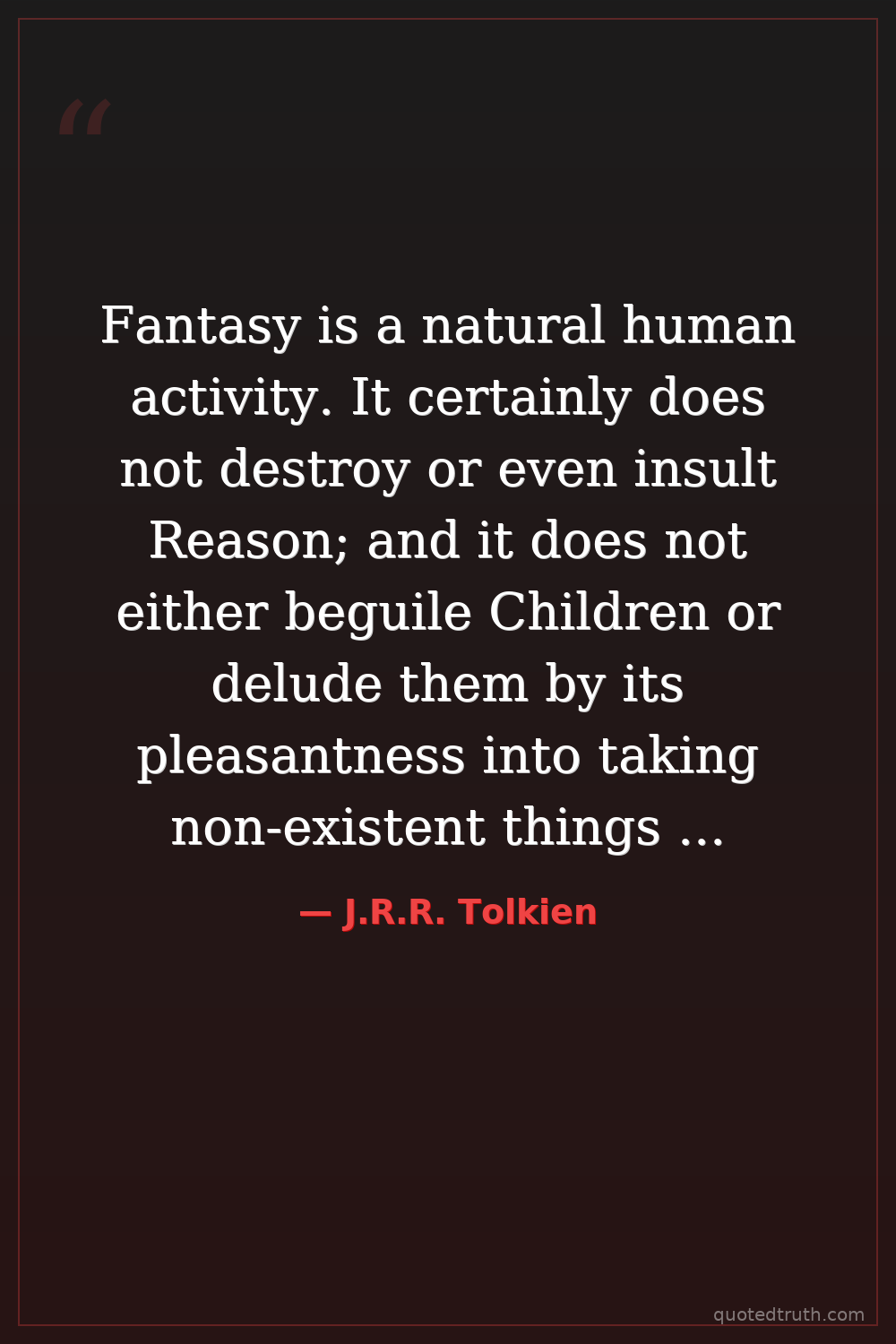 Fantasy is a natural human activity. It certainly does not destroy or even insult Reason; and it does not either beguile Children or delude them by its pleasantness into taking non-existent things for real. On the contrary, of all the faculties of man, Fantasy is the one least injured by the Fall and still remains in a measure the creative power of God's image.