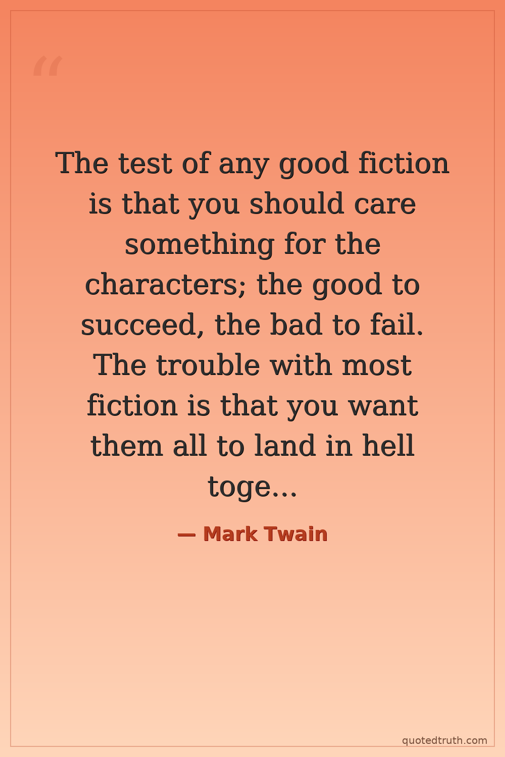 The test of any good fiction is that you should care something for the characters; the good to succeed, the bad to fail. The trouble with most fiction is that you want them all to land in hell together, as quickly as possible.