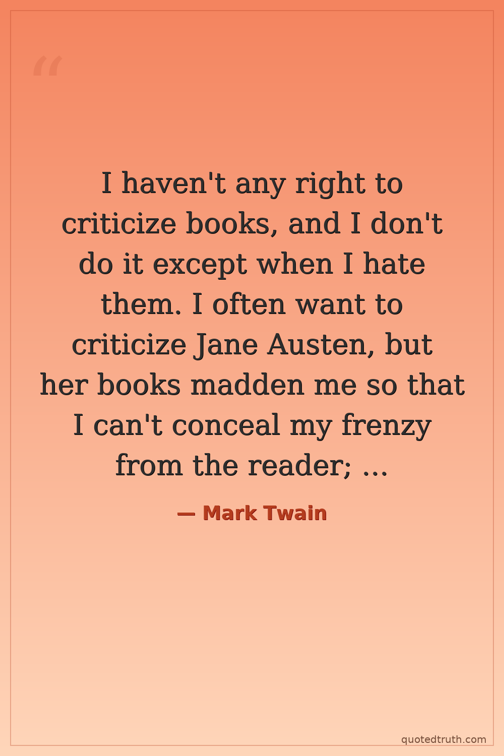 I haven't any right to criticize books, and I don't do it except when I hate them. I often want to criticize Jane Austen, but her books madden me so that I can't conceal my frenzy from the reader; and therefore I have to stop every time I begin. Every time I read Pride and Prejudice I want to dig her up and beat her over the skull with her own shin-bone.