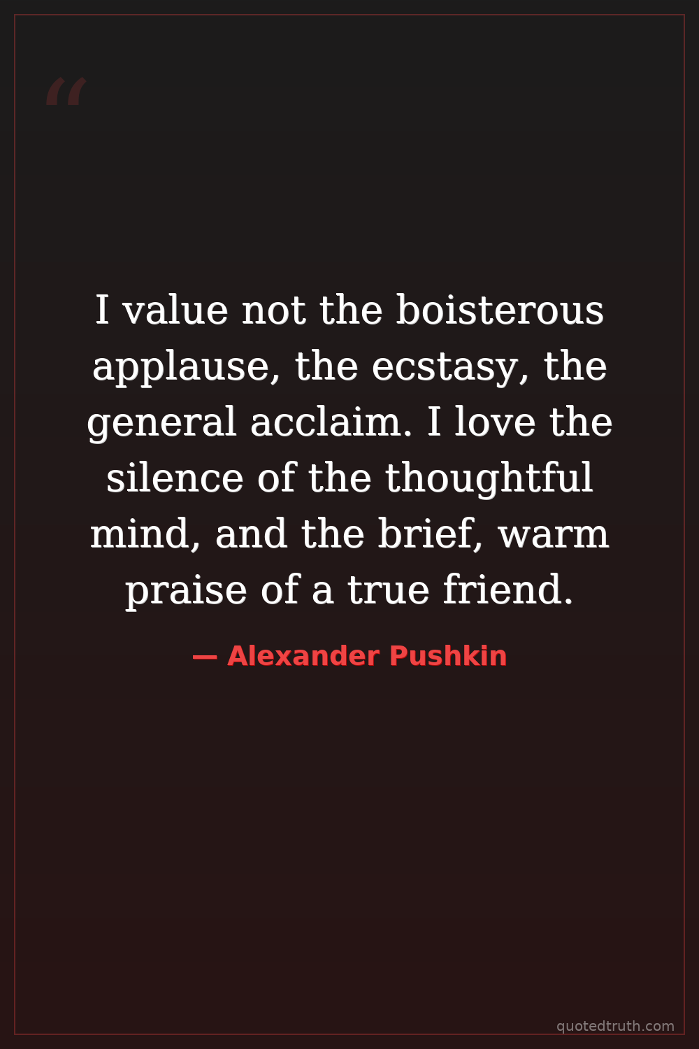 I value not the boisterous applause, the ecstasy, the general acclaim. I love the silence of the thoughtful mind, and the brief, warm praise of a true friend.