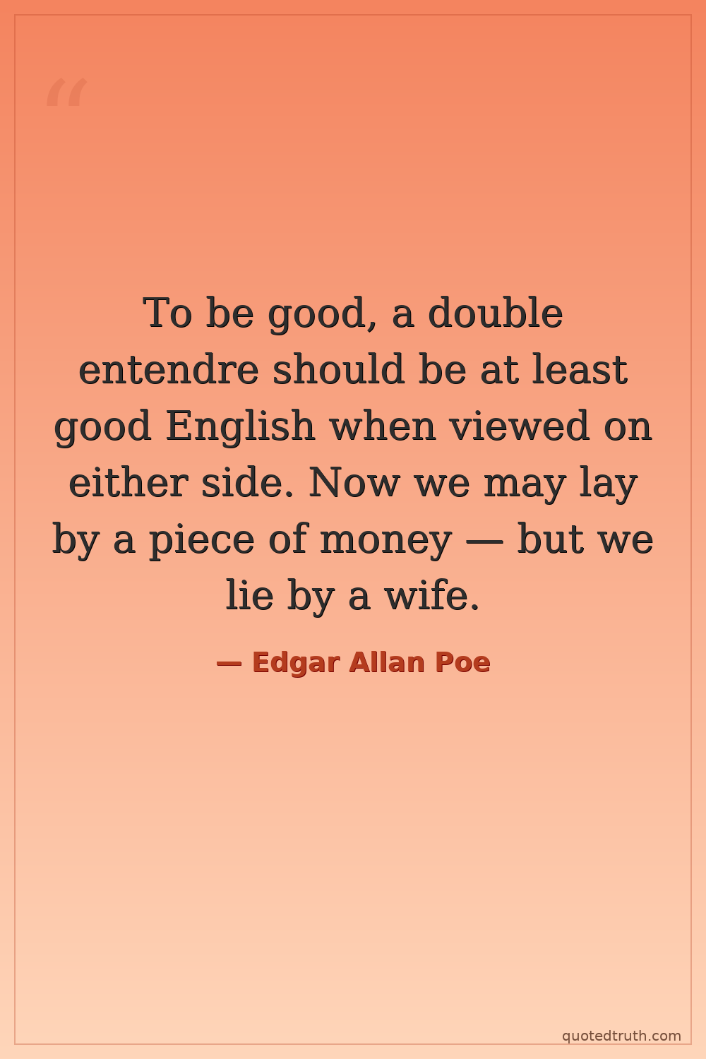 To be good, a double entendre should be at least good English when viewed on either side. Now we may lay by a piece of money — but we lie by a wife.