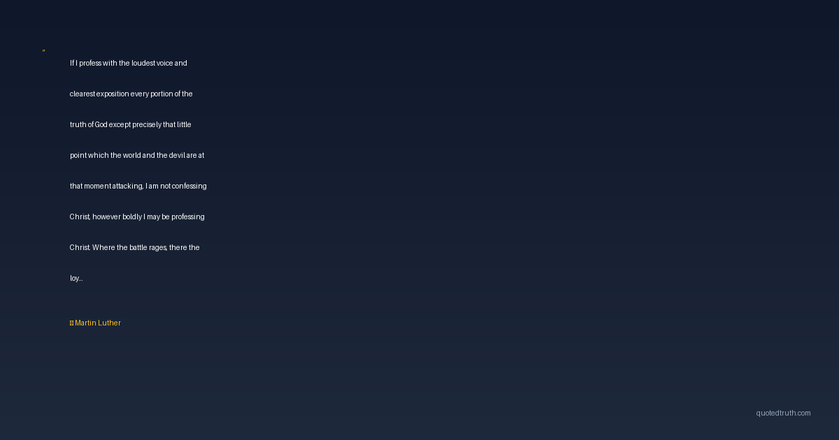 If I profess with the loudest voice and clearest exposition every portion of the truth of God except precisely that little point which the world and the devil are at that moment attacking, I am not confessing Christ, however boldly I may be professing Christ. Where the battle rages, there the loyalty of the soldier is proved; and to be steady on all the battlefield besides, is mere flight and disgrace if he flinches at that one point.