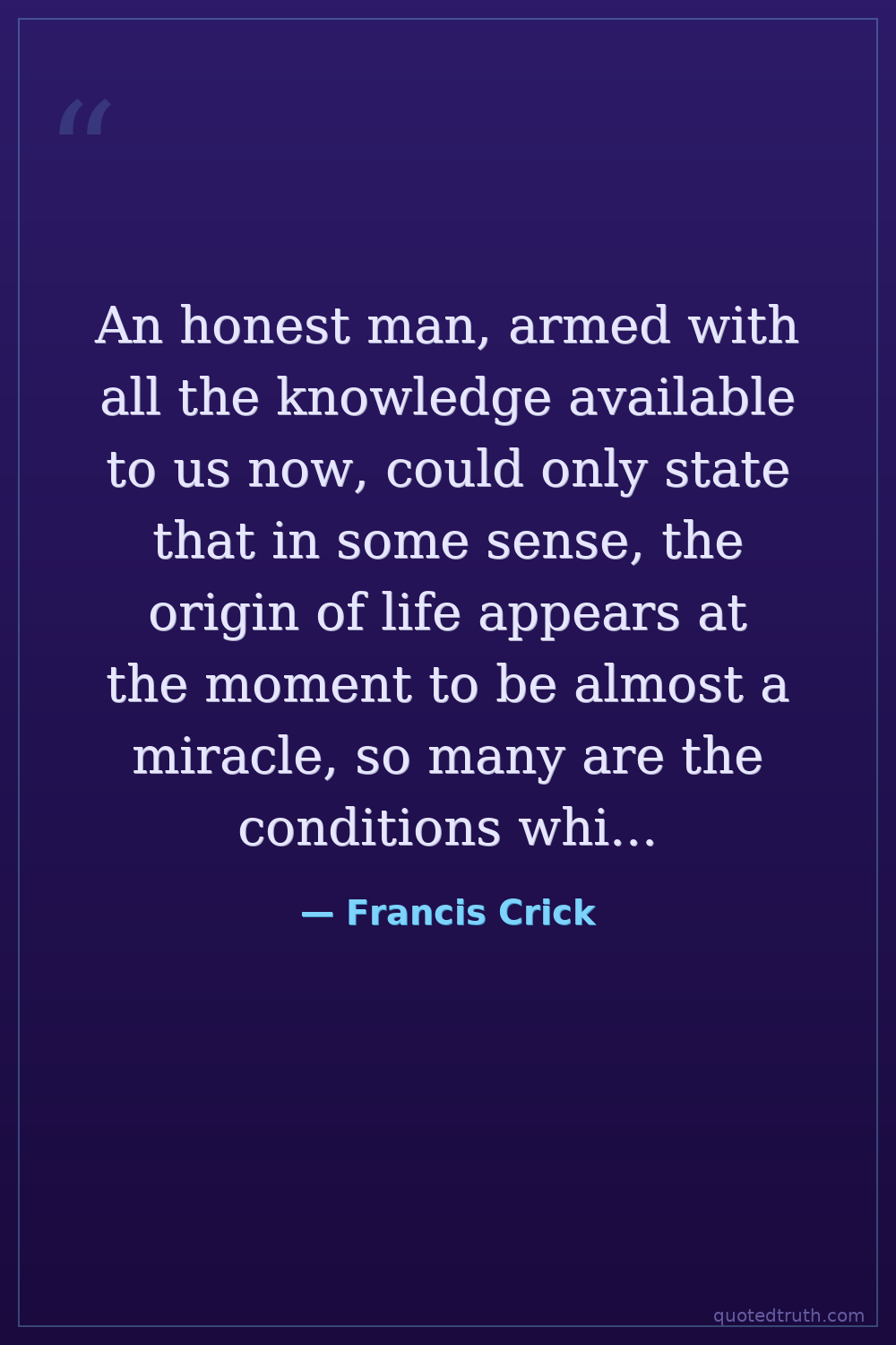 An honest man, armed with all the knowledge available to us now, could only state that in some sense, the origin of life appears at the moment to be almost a miracle, so many are the conditions which would have had to have been satisfied to get it going.