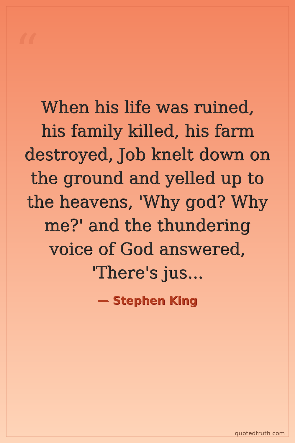 When his life was ruined, his family killed, his farm destroyed, Job knelt down on the ground and yelled up to the heavens, 'Why god? Why me?' and the thundering voice of God answered, 'There's just something about you that pisses me off.'