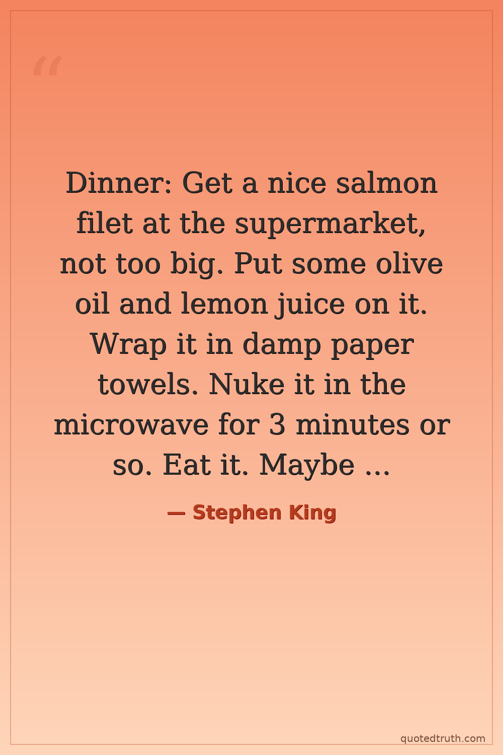 Dinner: Get a nice salmon filet at the supermarket, not too big. Put some olive oil and lemon juice on it. Wrap it in damp paper towels. Nuke it in the microwave for 3 minutes or so. Eat it. Maybe add a salad.
