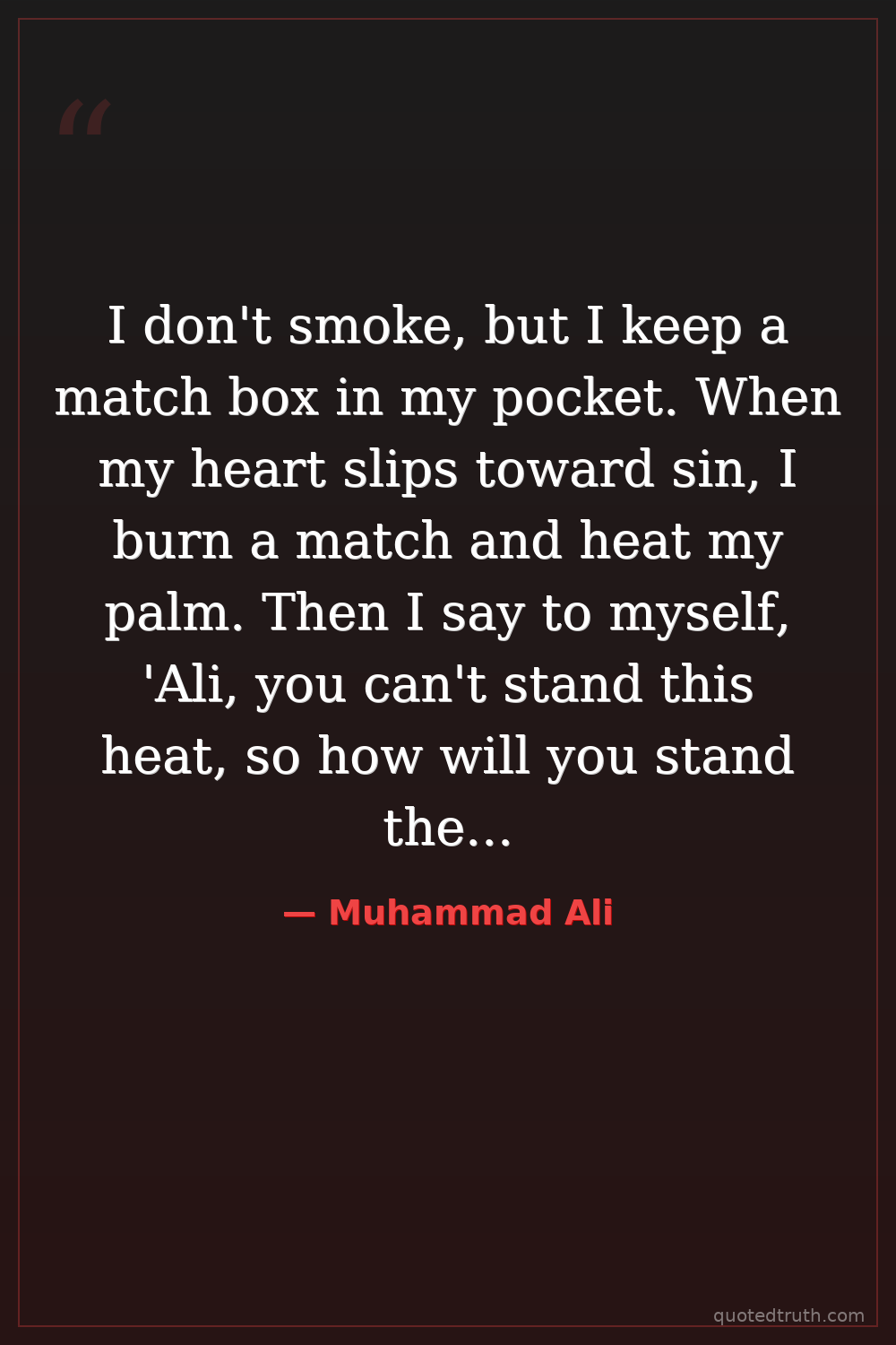 I don't smoke, but I keep a match box in my pocket. When my heart slips toward sin, I burn a match and heat my palm. Then I say to myself, 'Ali, you can't stand this heat, so how will you stand the heat of hell?' — Muhammad Ali Modern Boxer, activist, greatest of all time
