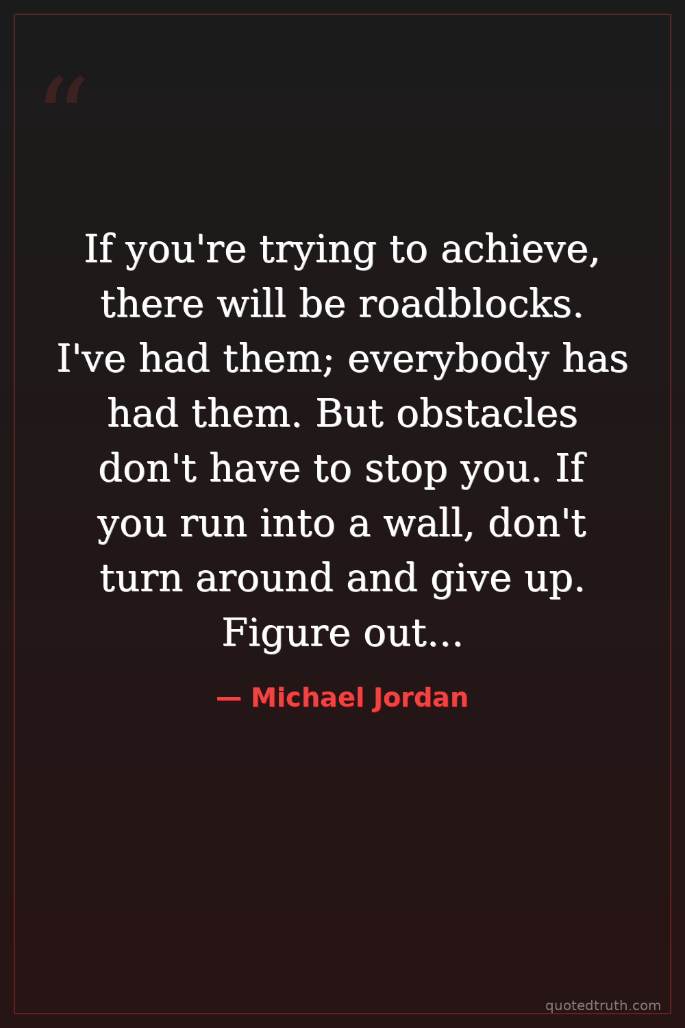 If you're trying to achieve, there will be roadblocks. I've had them; everybody has had them. But obstacles don't have to stop you. If you run into a wall, don't turn around and give up. Figure out how to climb it, go through it, or work around it.
