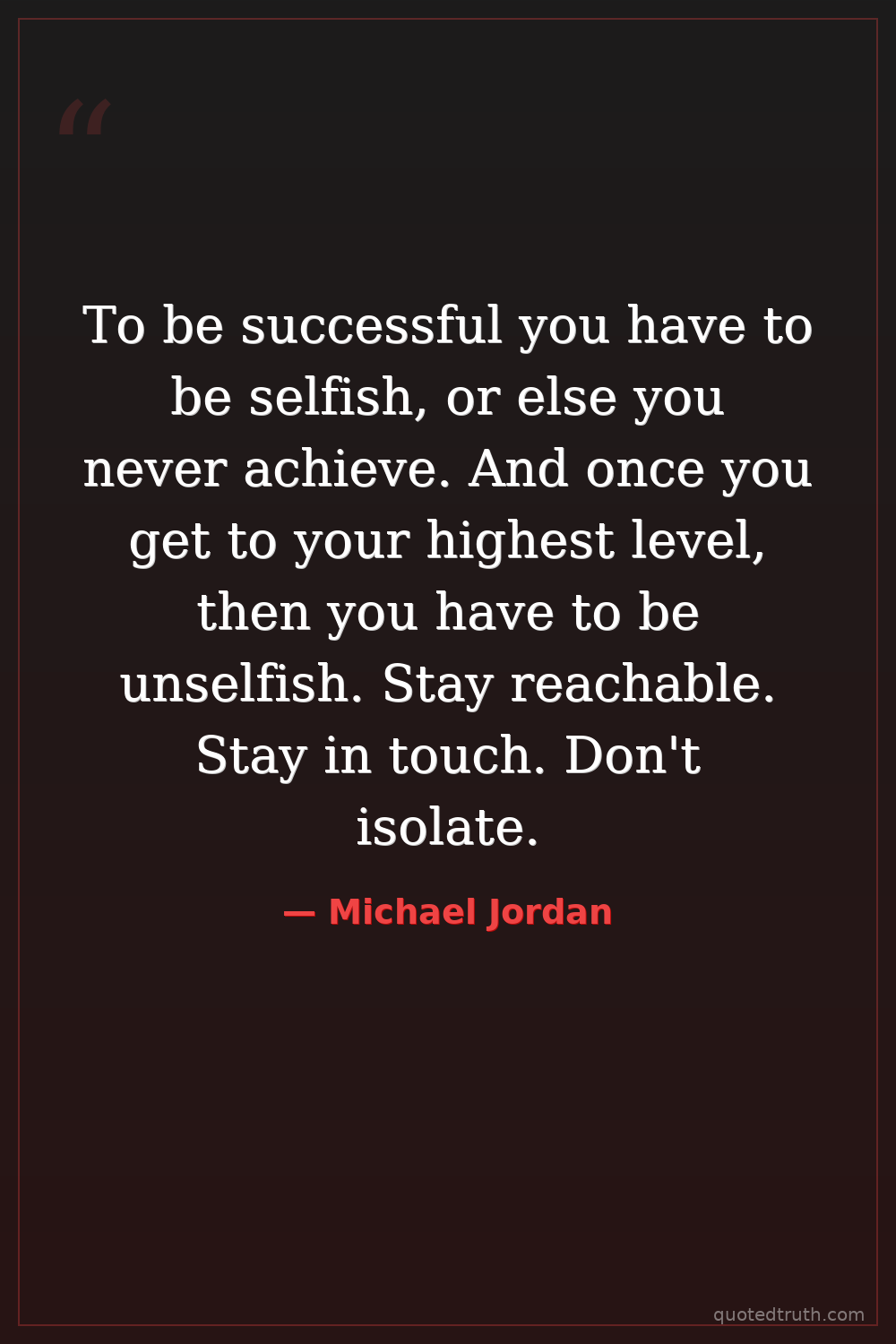 To be successful you have to be selfish, or else you never achieve. And once you get to your highest level, then you have to be unselfish. Stay reachable. Stay in touch. Don't isolate.