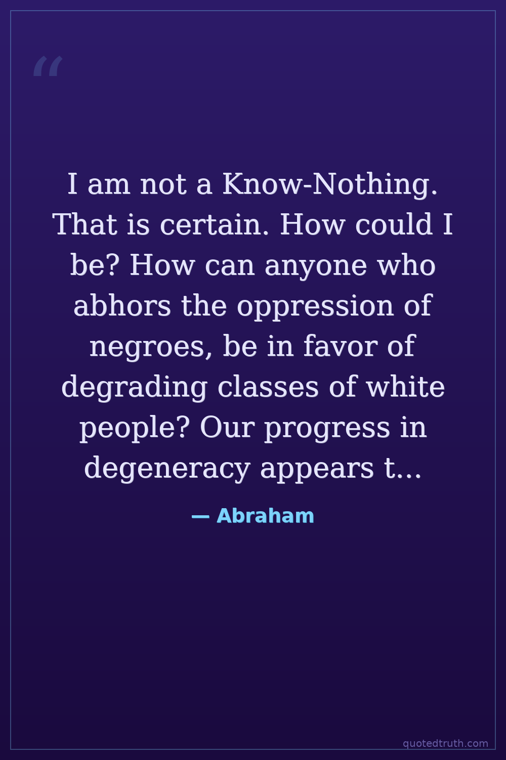 I am not a Know-Nothing. That is certain. How could I be? How can anyone who abhors the oppression of negroes, be in favor of degrading classes of white people? Our progress in degeneracy appears to me to be pretty rapid. As a nation, we began by declaring that 'all men are created equal.' We now practically read it 'all men are created equal, except negroes.' When the Know-Nothings get control, it will read 'all men are created equal, except negroes, and foreigners, and catholics.' When it comes to this I should prefer emigrating to some country where they make no pretence of loving liberty—to Russia, for instance, where despotism can be taken pure, and without the base alloy of hypocracy.