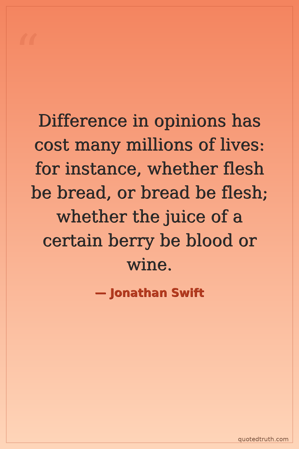 Difference in opinions has cost many millions of lives: for instance, whether flesh be bread, or bread be flesh; whether the juice of a certain berry be blood or wine.